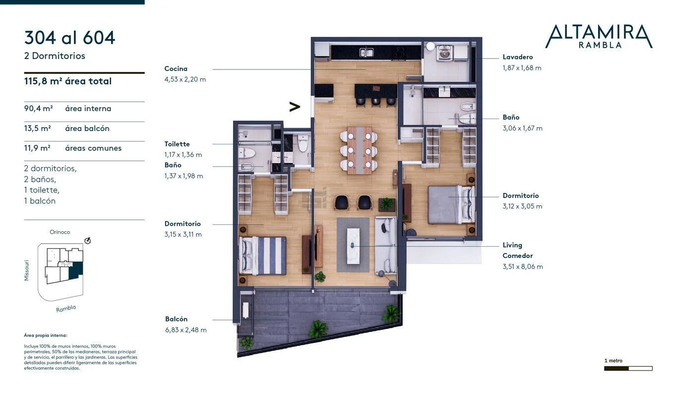 Dispone de dos dormitorios en suite, ambos con placares tipo vestidor, brindando confort y privacidad.