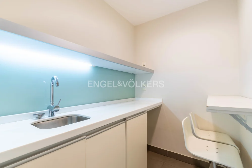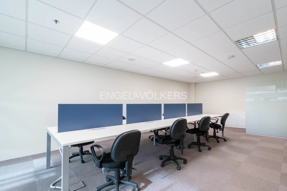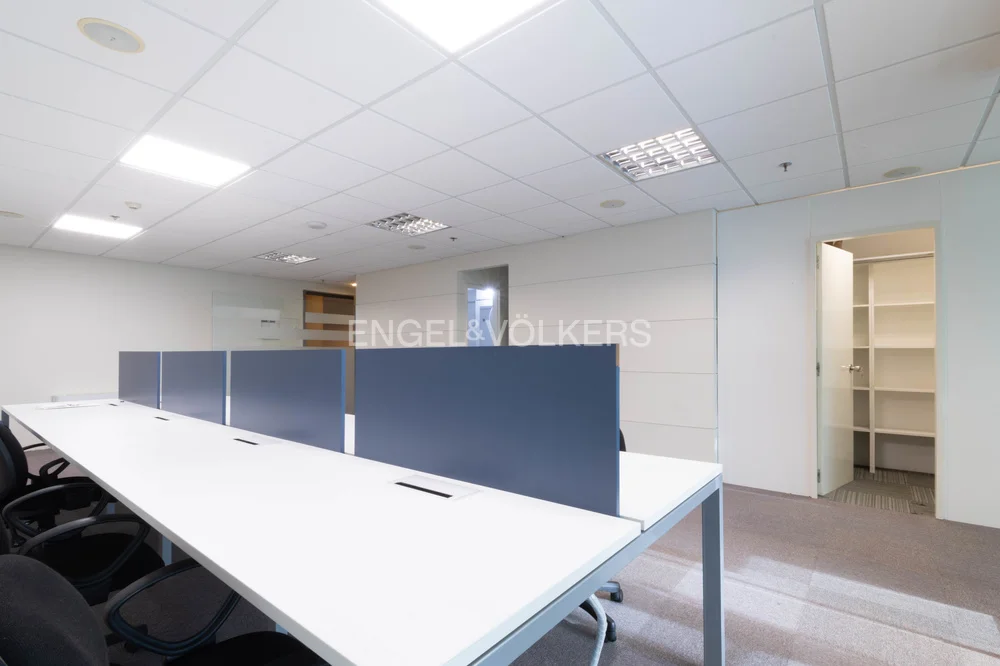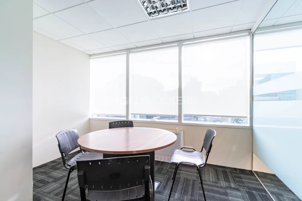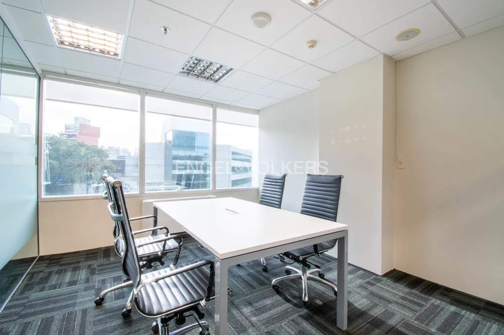 Dispone de un amplio open space con capacidad para ocho posiciones, dos privados equipados para cuatro personas cada uno, tipo sala de reunión o escritorio. Cuenta con tizanería con barra para almuerzo, bacha, espacio de almacenamiento y heladera. Baño completo. Rack para equipamiento de tecnología, piso técnico, instalación para datos y teléfono. Placard tipo archivero. Tres equipos de aire acondicionado independientes en cada ambiente.