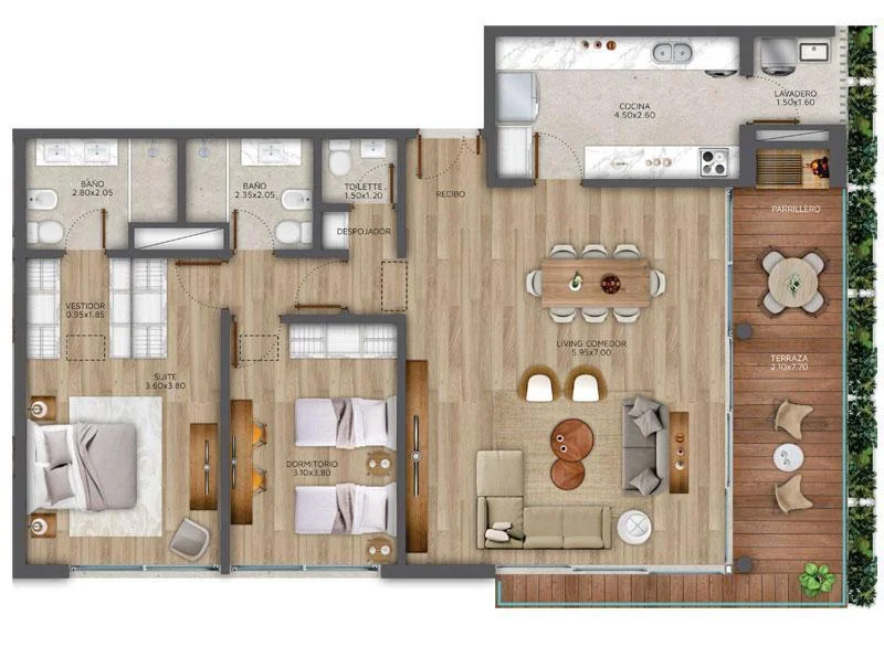 Con terminaciones de primer nivel, materiales nobles, naturales y sustentables, pisos de Roble Natural multicapa.Aberturas de alta prestación con doble vidrio. Carpintería de Roble Natural para puertas y zócalos. Equipamientos de cocina importados de alta gama. Revestimientos de pisos y paredes importados. Losas y griferías importadas de alta gama.