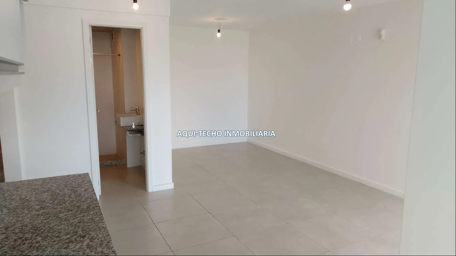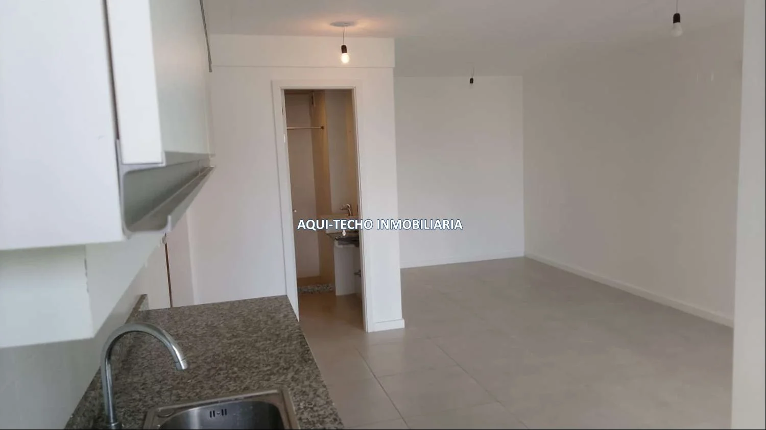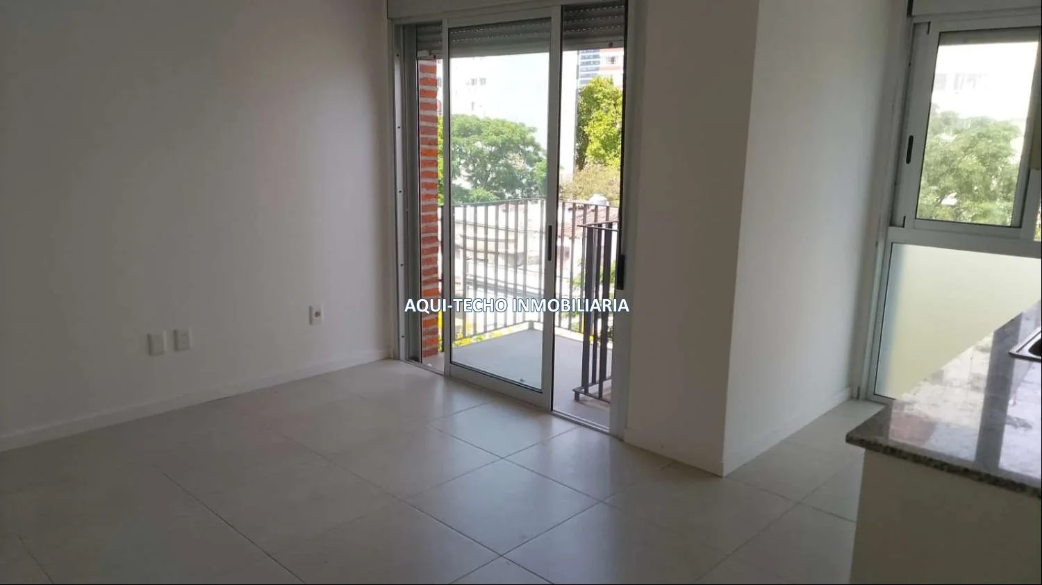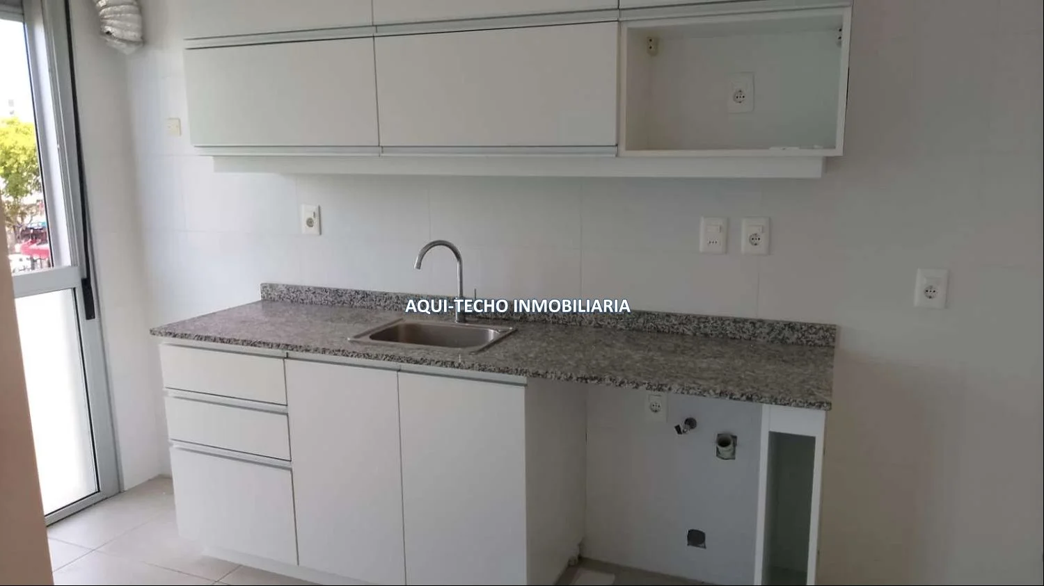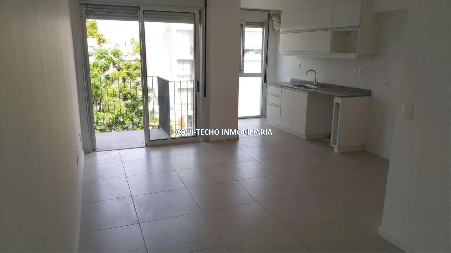 Luminoso living-comedor con cocina integrada con mesada de granito y placares superiores e inferiores.