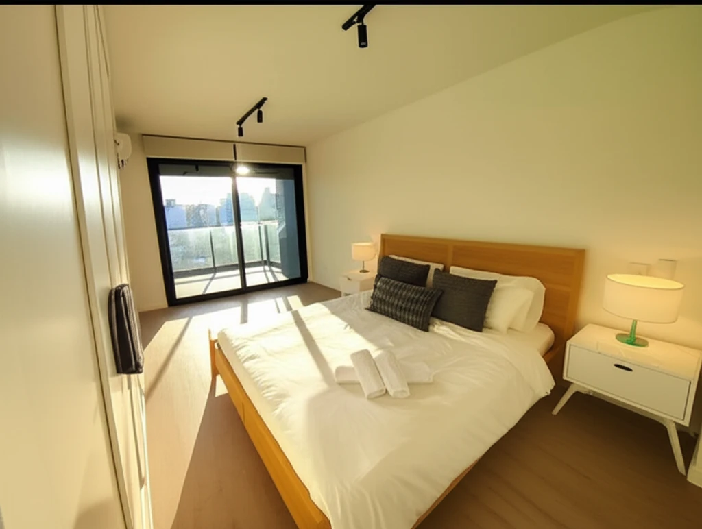 Posee un dormitorio con placar y ventanales panorámicos, con cortinas para bloquear la entrada de sol