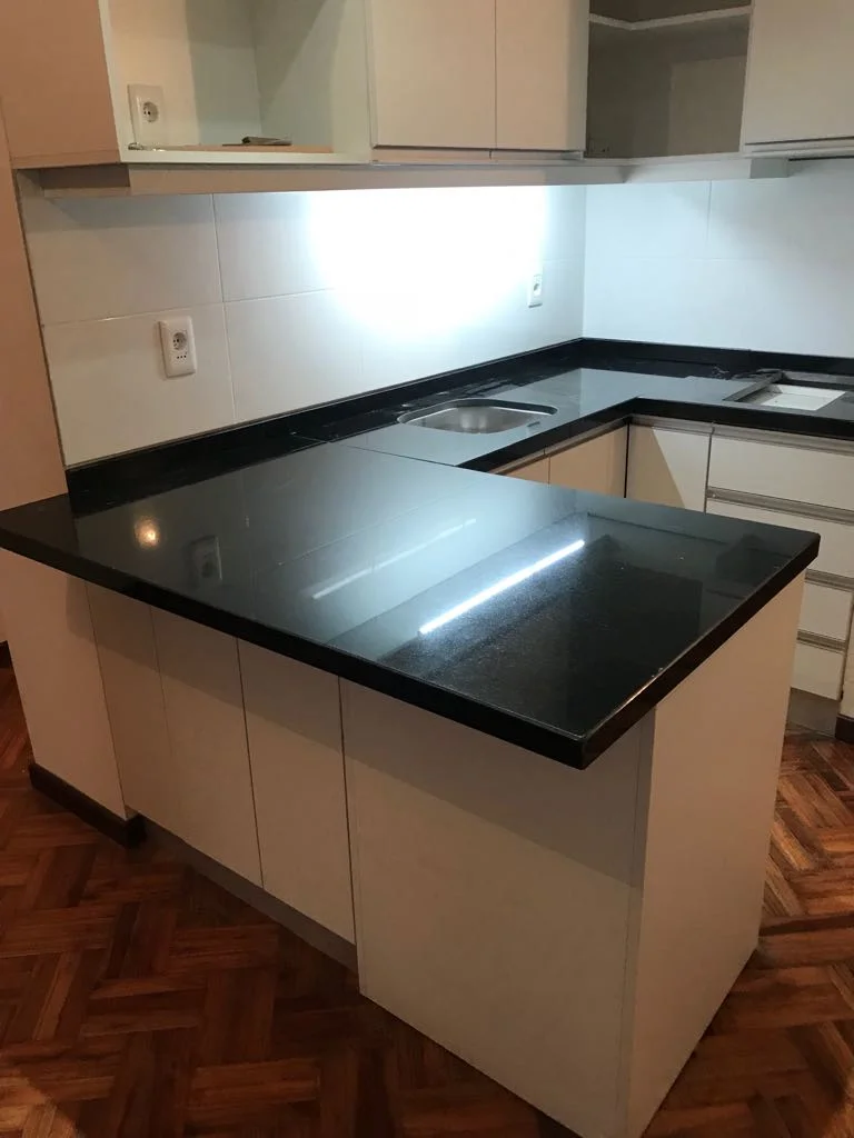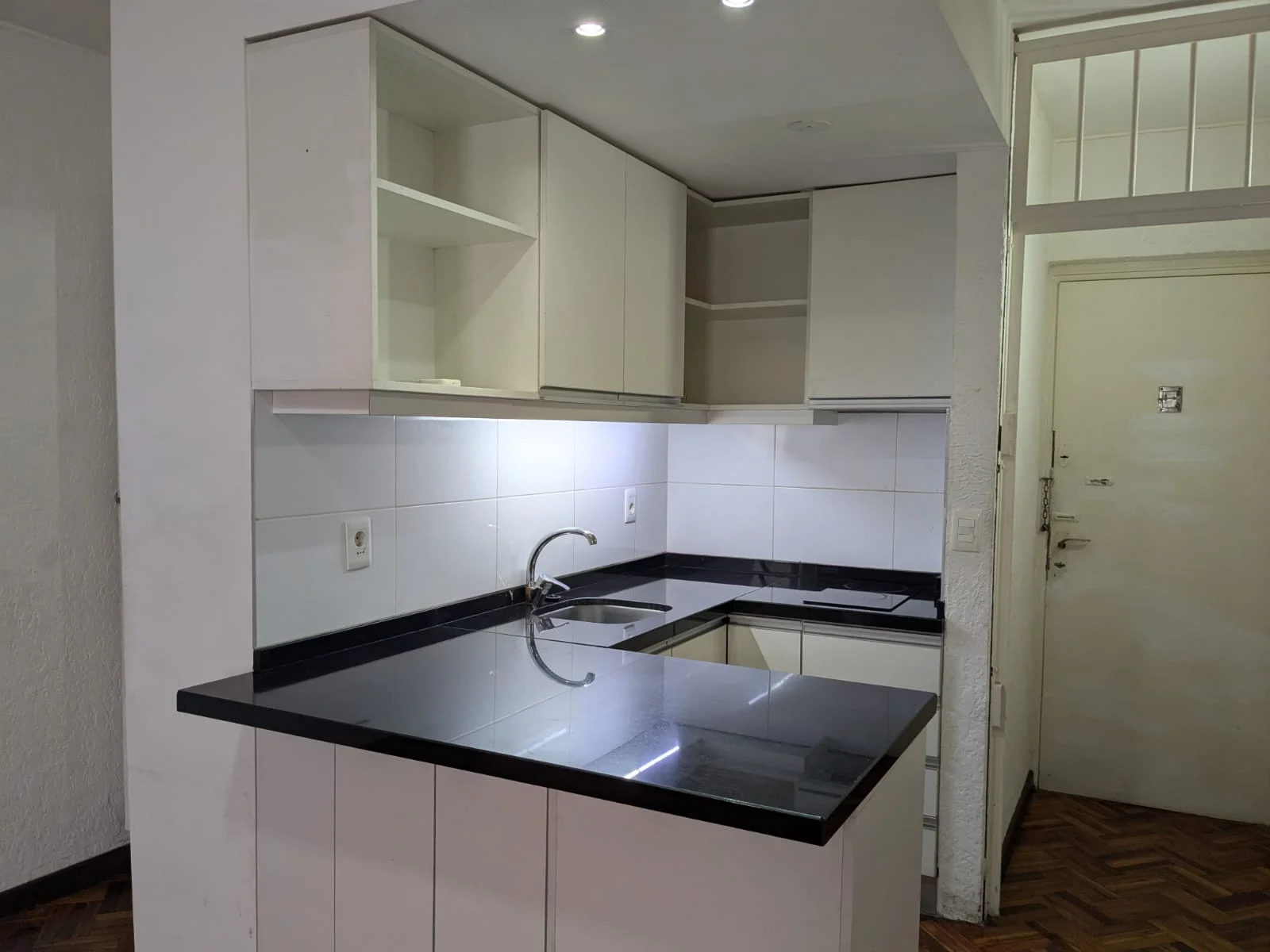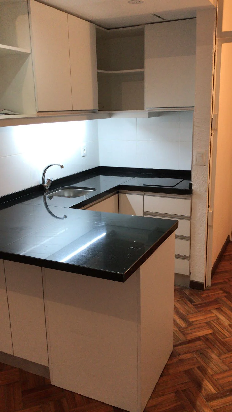 Living-comedor con cocina integrada de amplia mesada de granito con aire acondicionado.