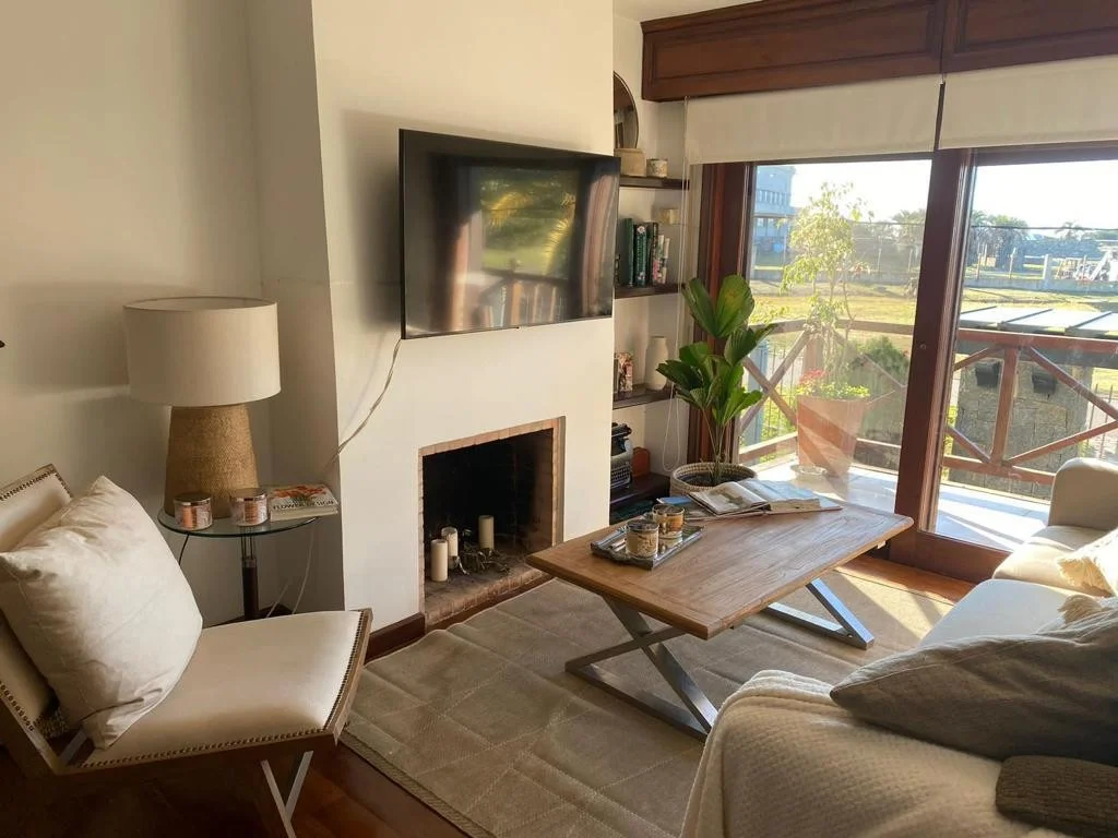 Living comedor con estufa a leña, y balcón al frente. Muebles de diseño.