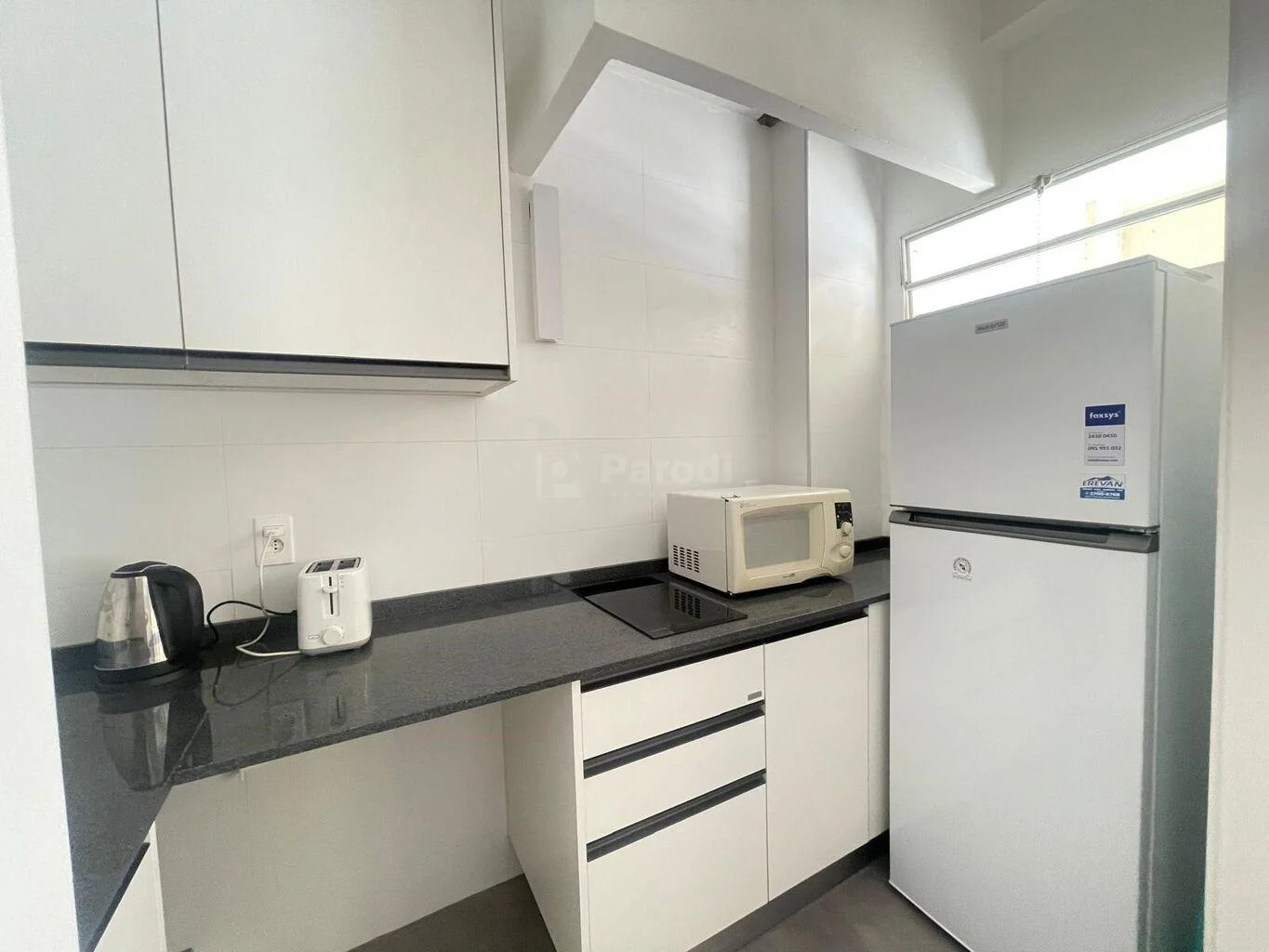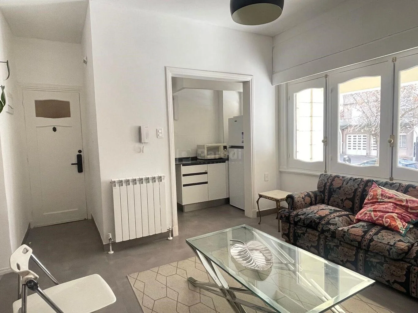 Living comedor con buena ventana y mucha luz, mirando hacia el exterior. Cocina integrada, reciclada con electodomesticos y vajilla completa.