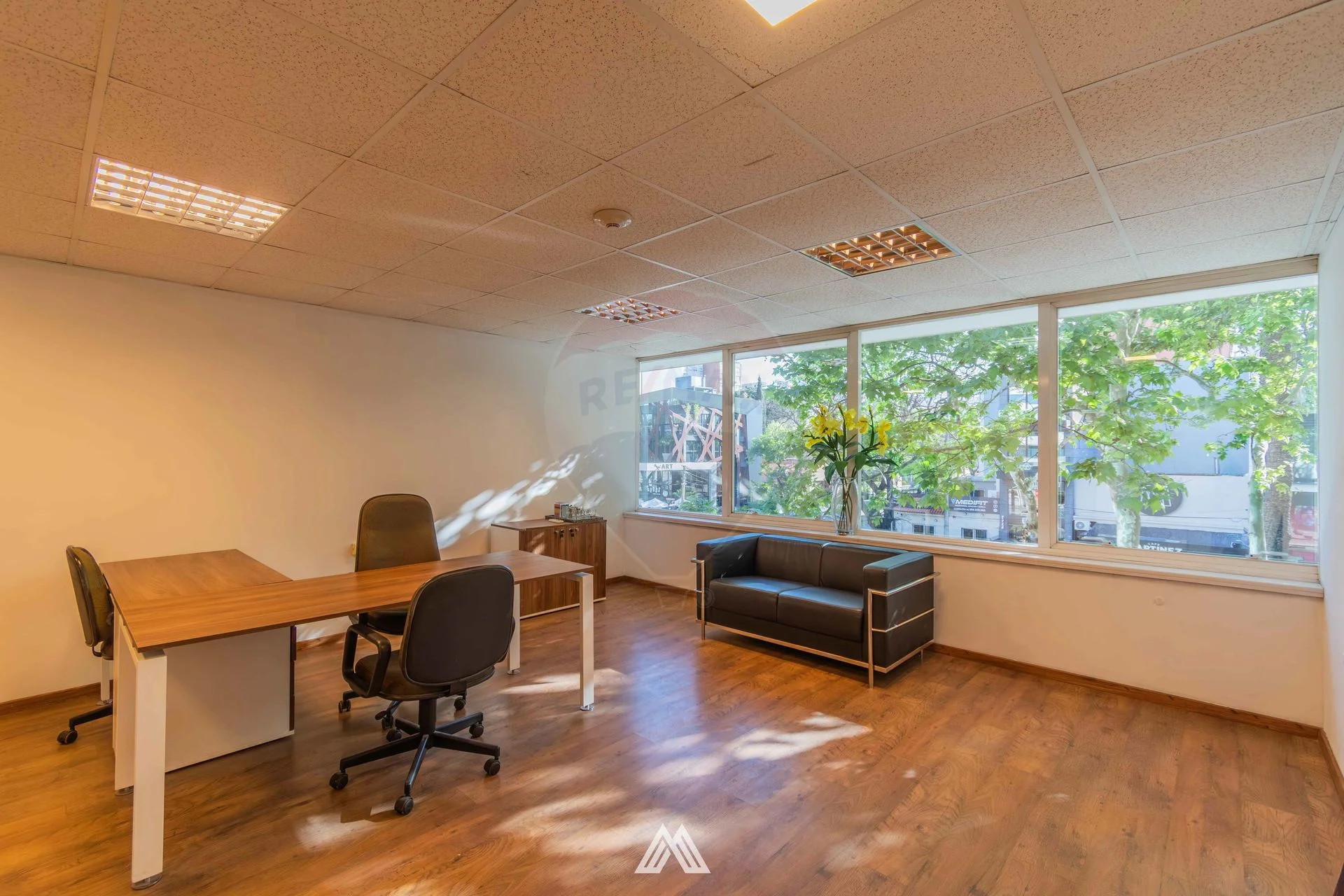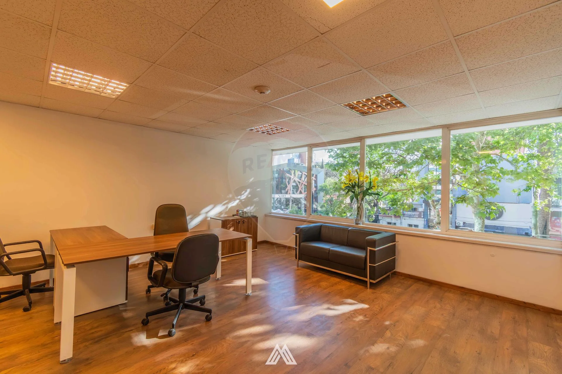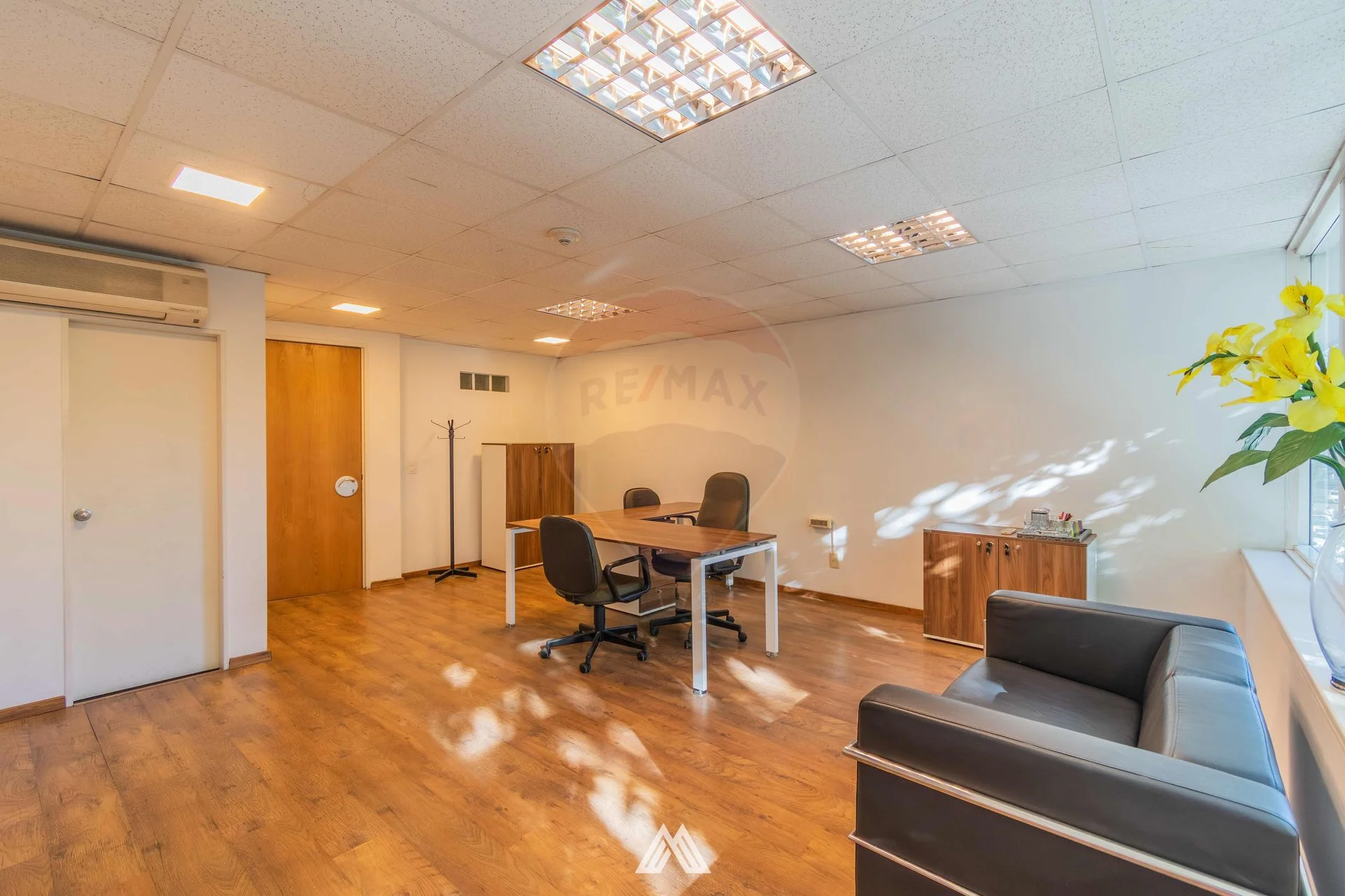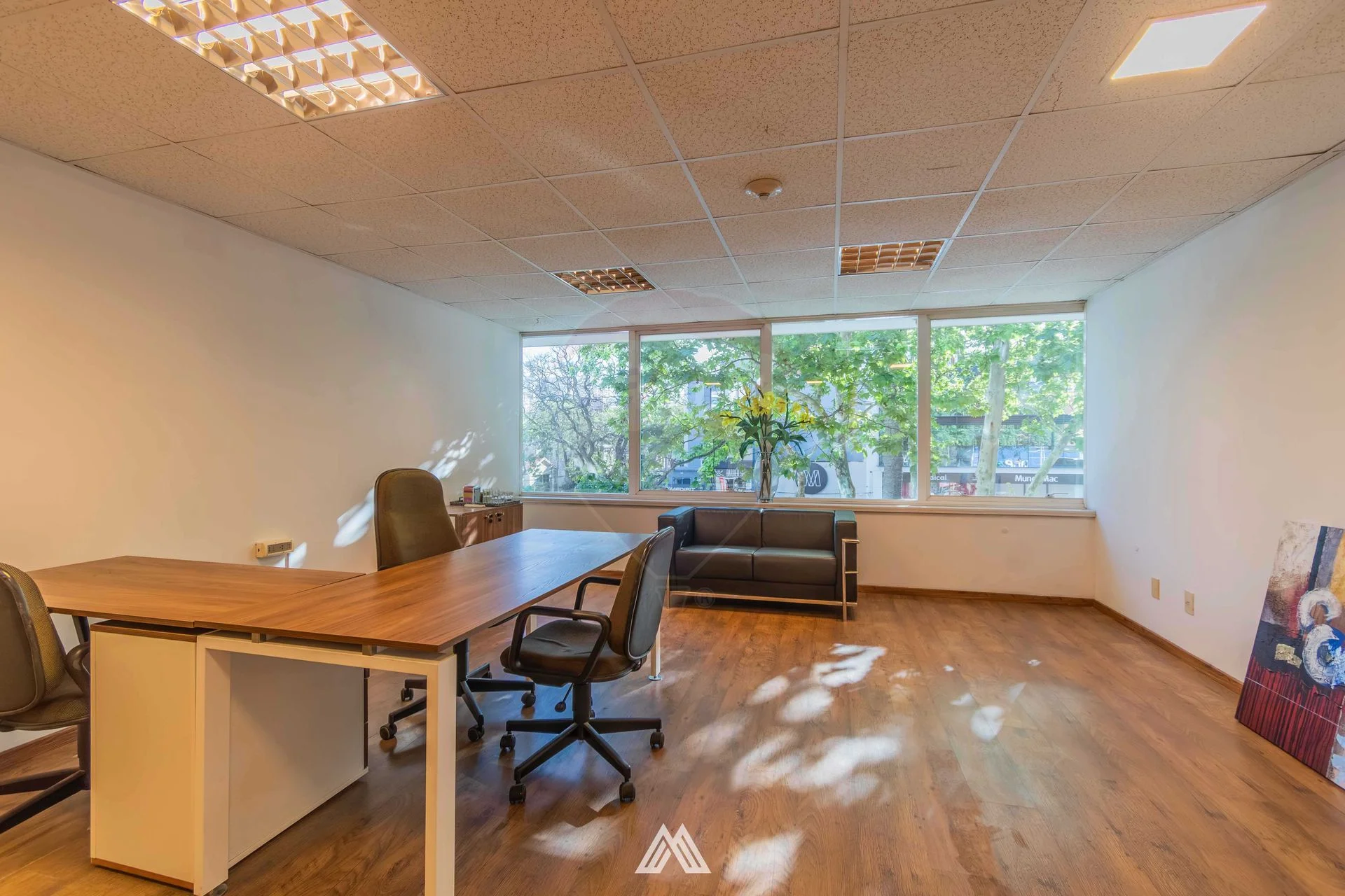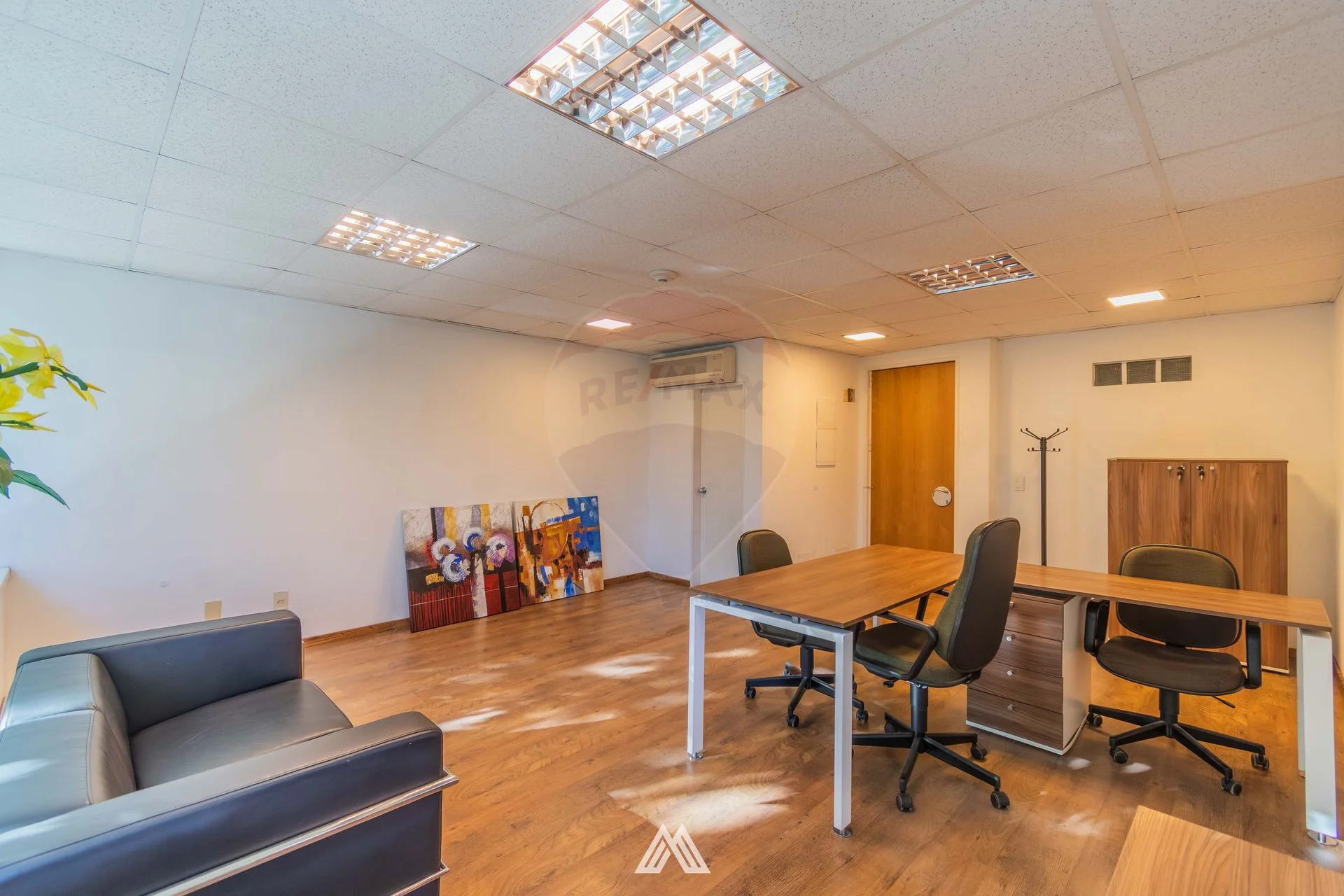 Cuenta con recepción, área de trabajo con escritorios y sillas ergonómicas, sala amplia y baño.