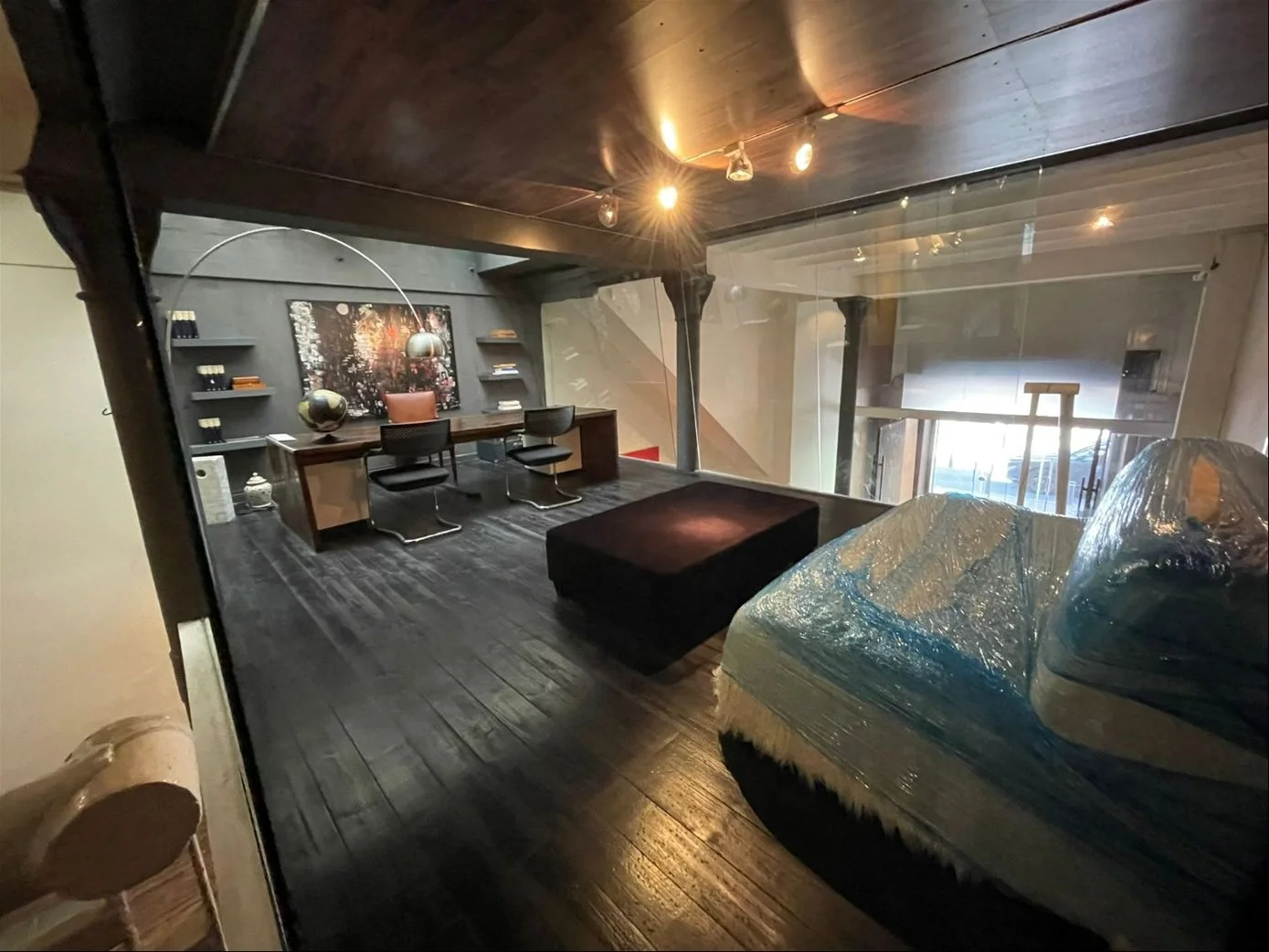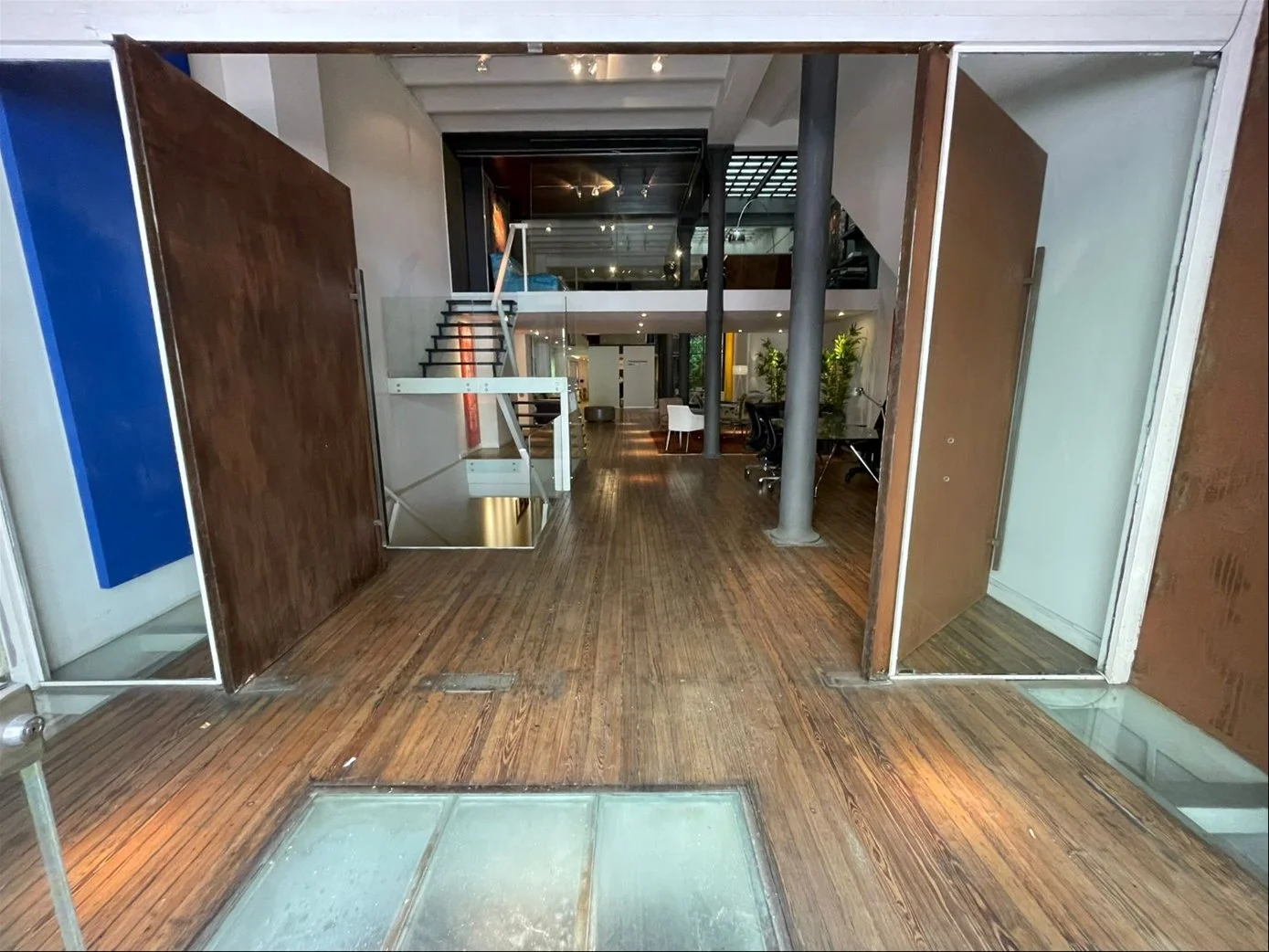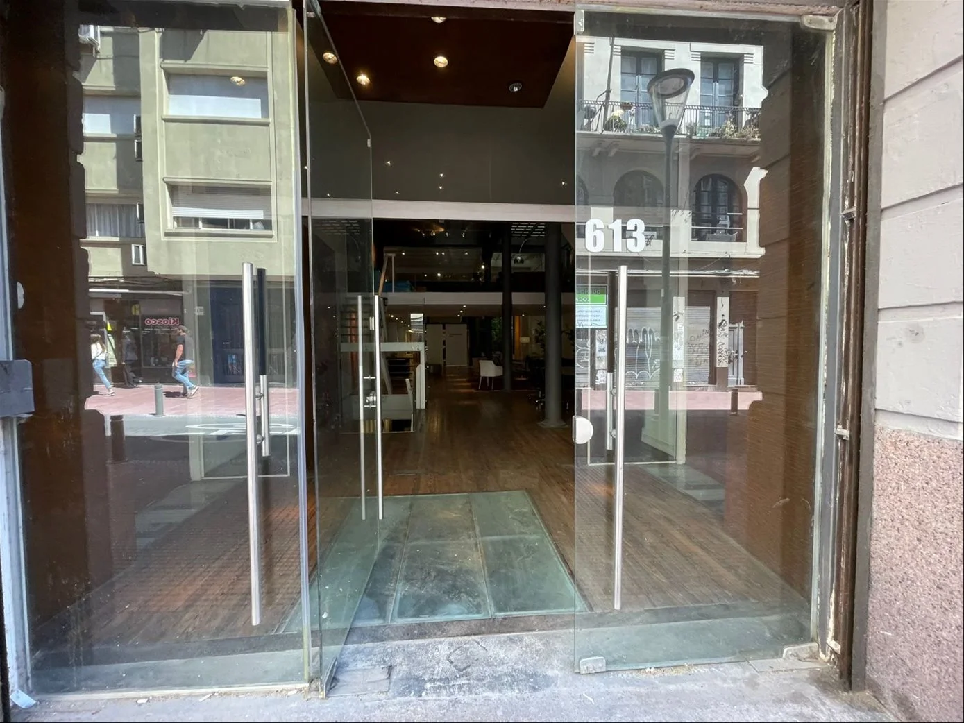 Una oficina con acceso a una de las calles mas emblemáticas de Ciudad Vieja, con puerta en cristal y una gran puerta principal en hierro añejado.