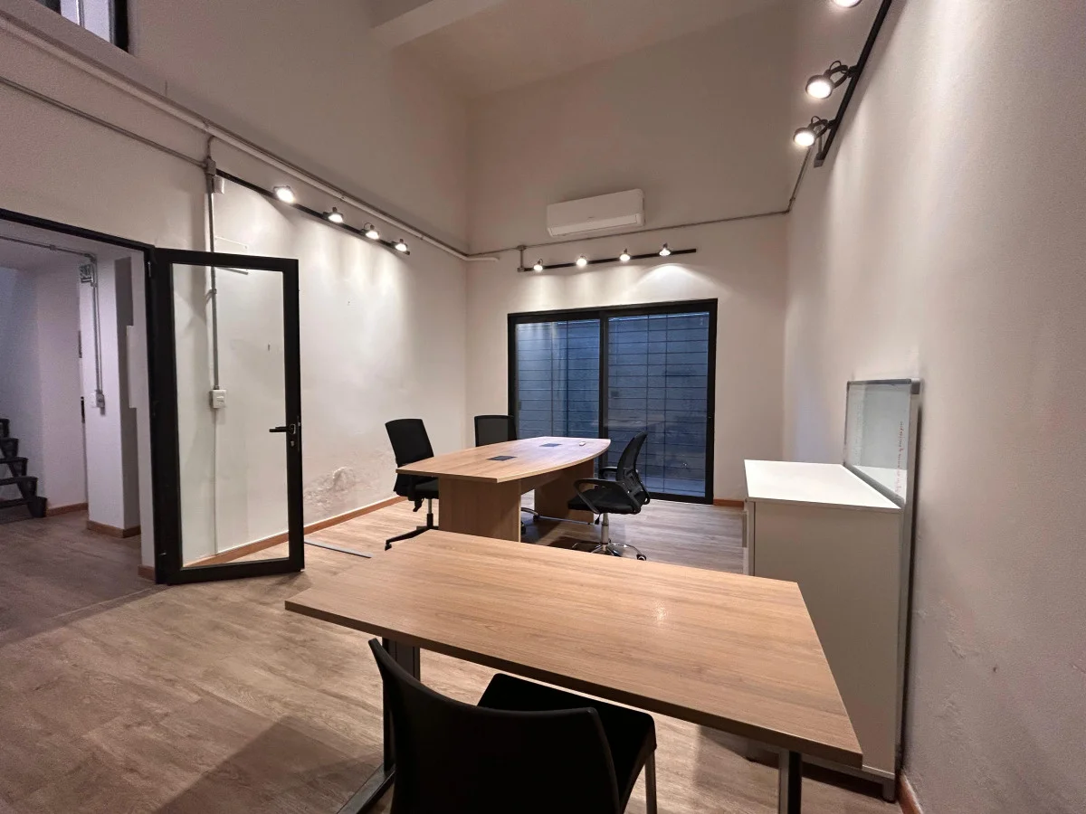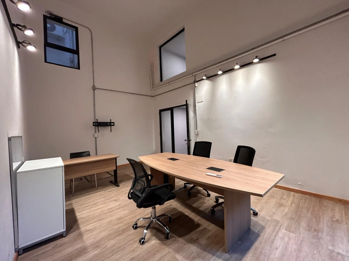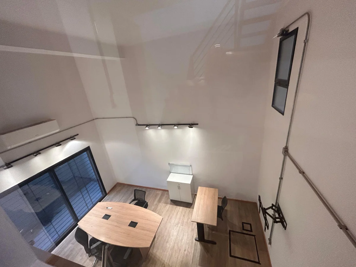 . Amplia oficina con estilo industrial, techos altos con vista hacia el patio, cuenta con aire, un escritorio, mesa grande, sillas y placar