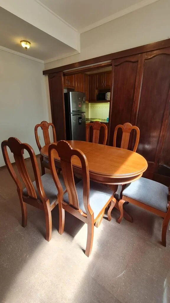 Sala de estar y recibidor están amueblados tiene aire acondicionado, dan al frente con un gran ventanal doble y salida al balcón.