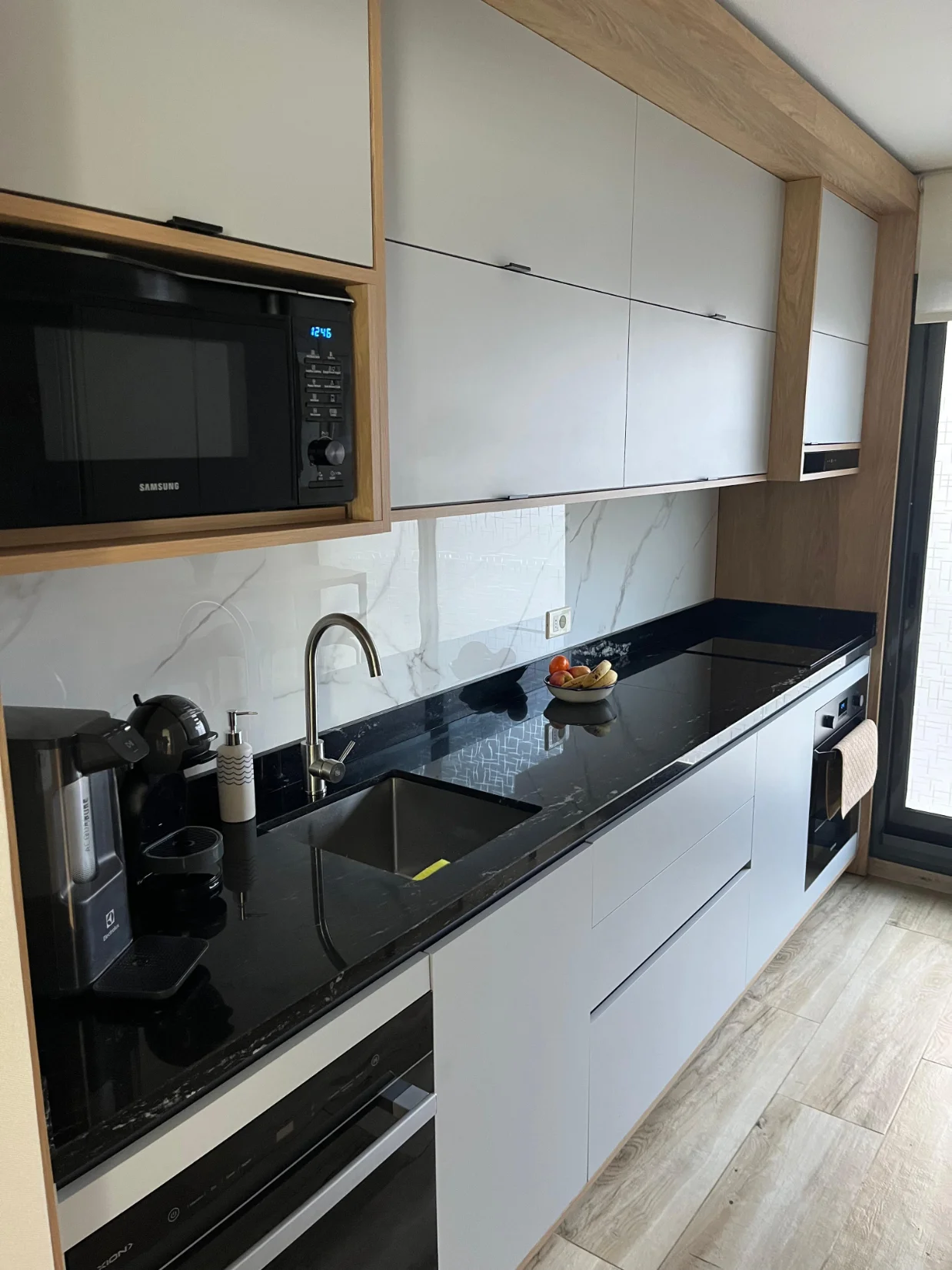La cocina, renovada recientemente, incluye equipamiento y mobiliario hechos a medida, optimizando cada espacio y con salida a una terraza de servicio.