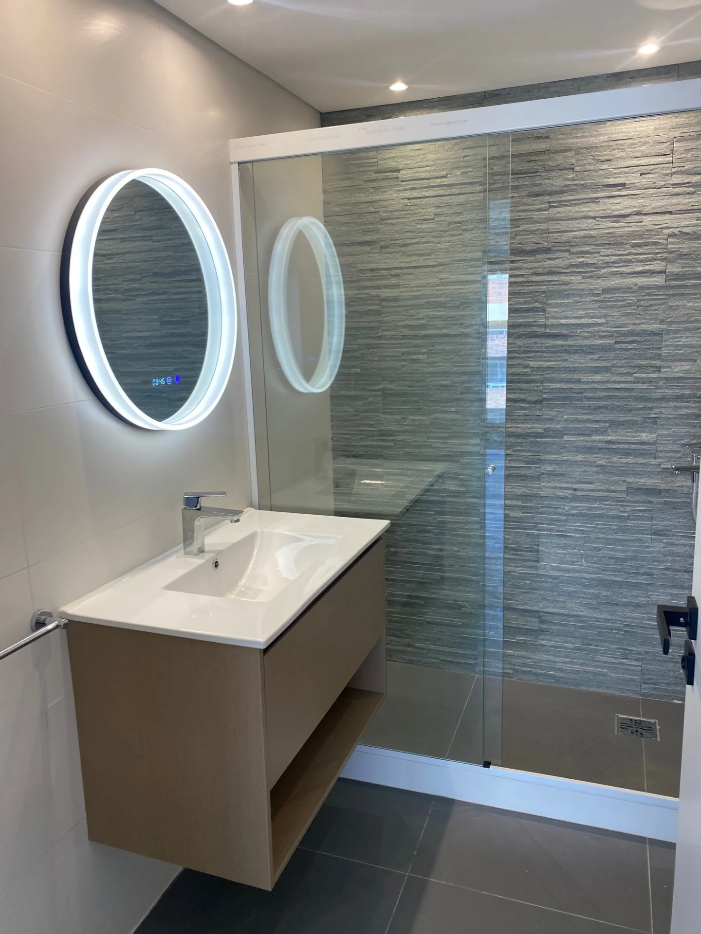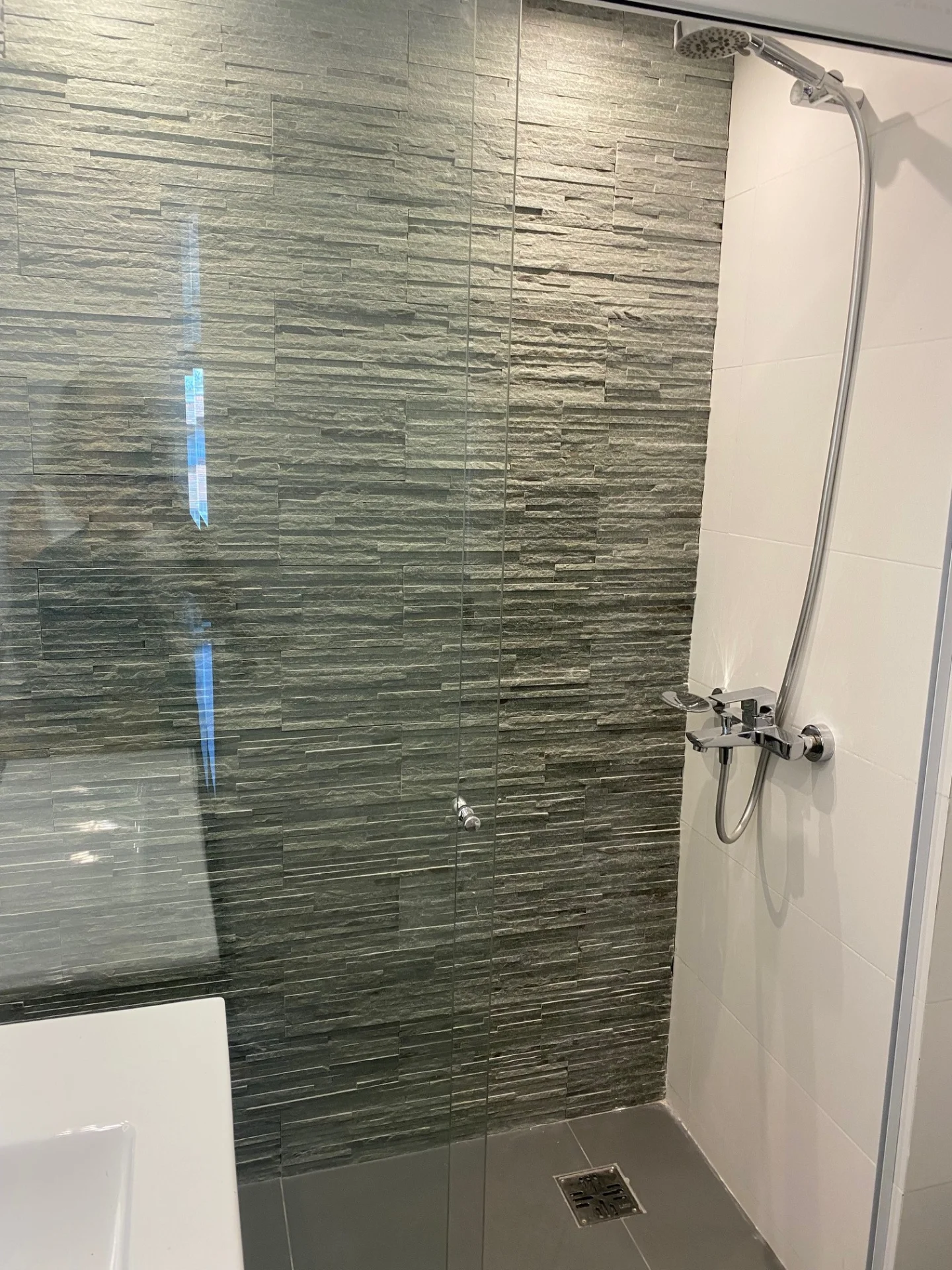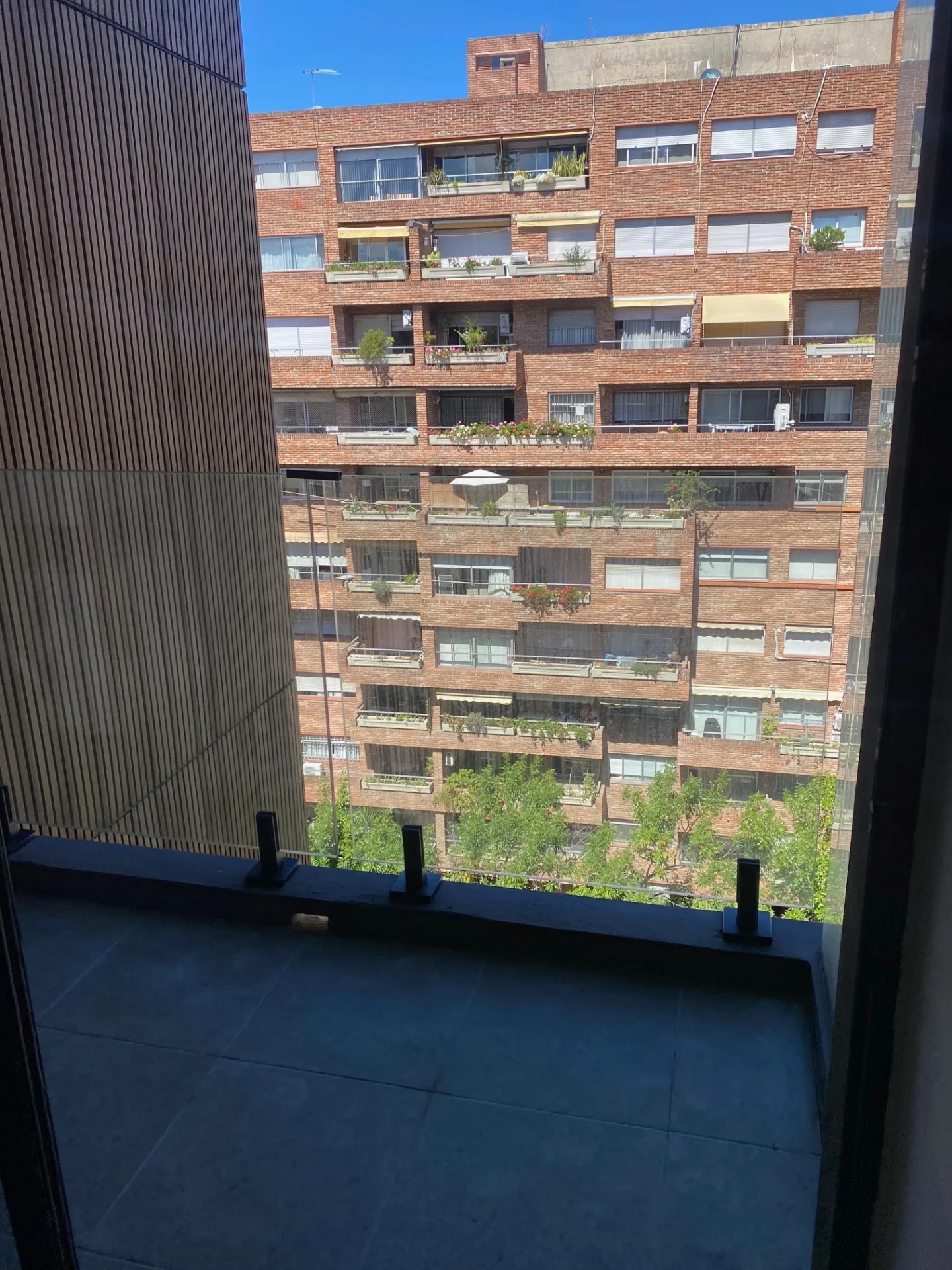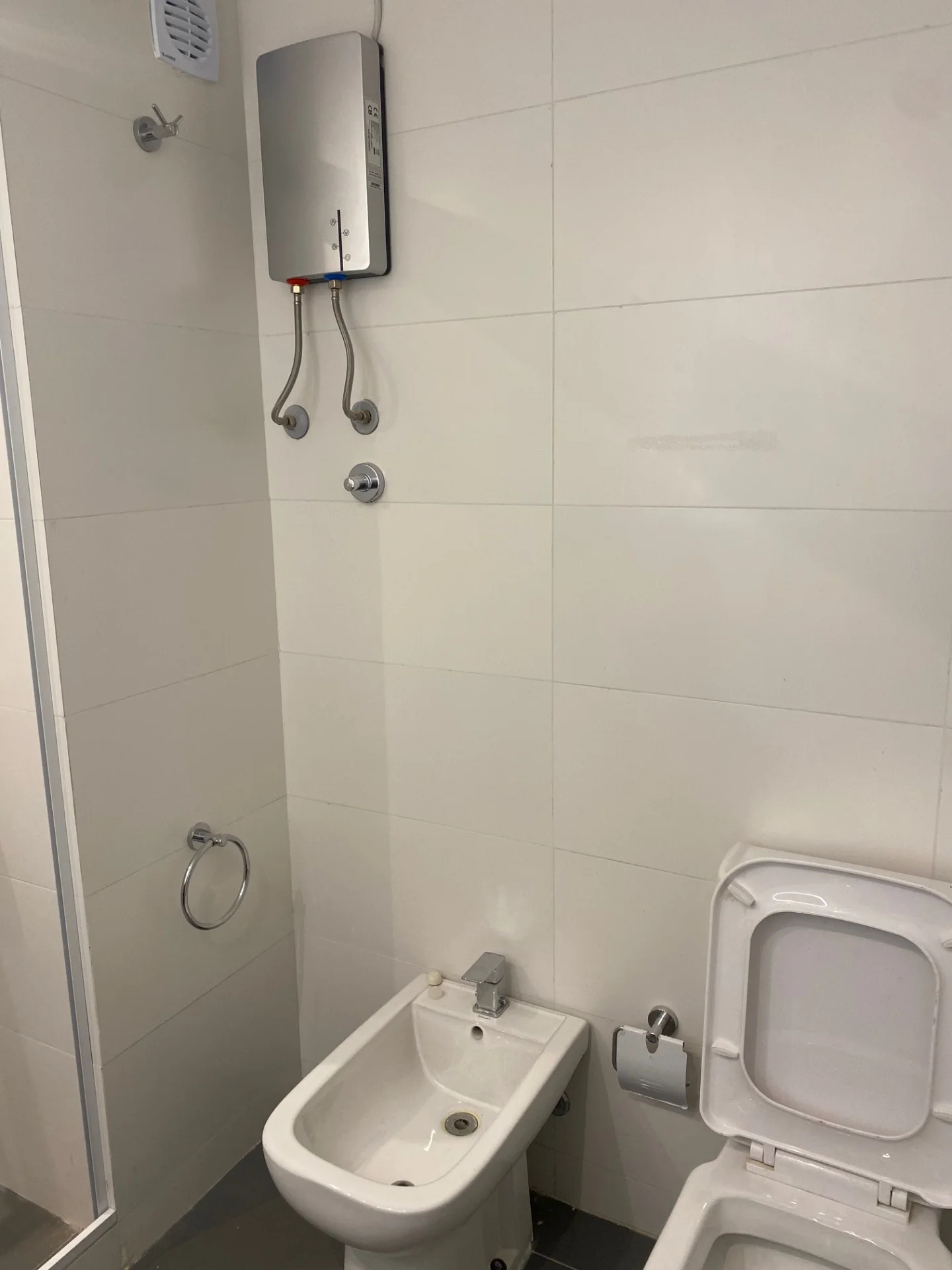 El dormitorio, también orientado al frente, dispone de placard, aire acondicionado y baño en suite completo, con mampara de cristal instalada calentador instalado.