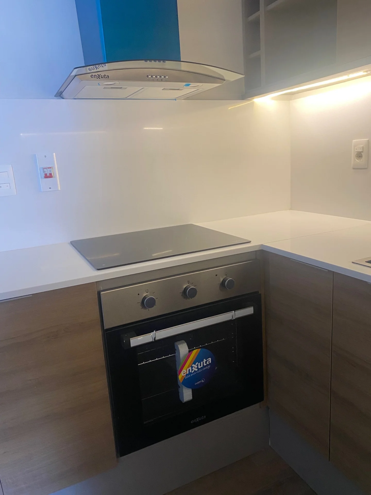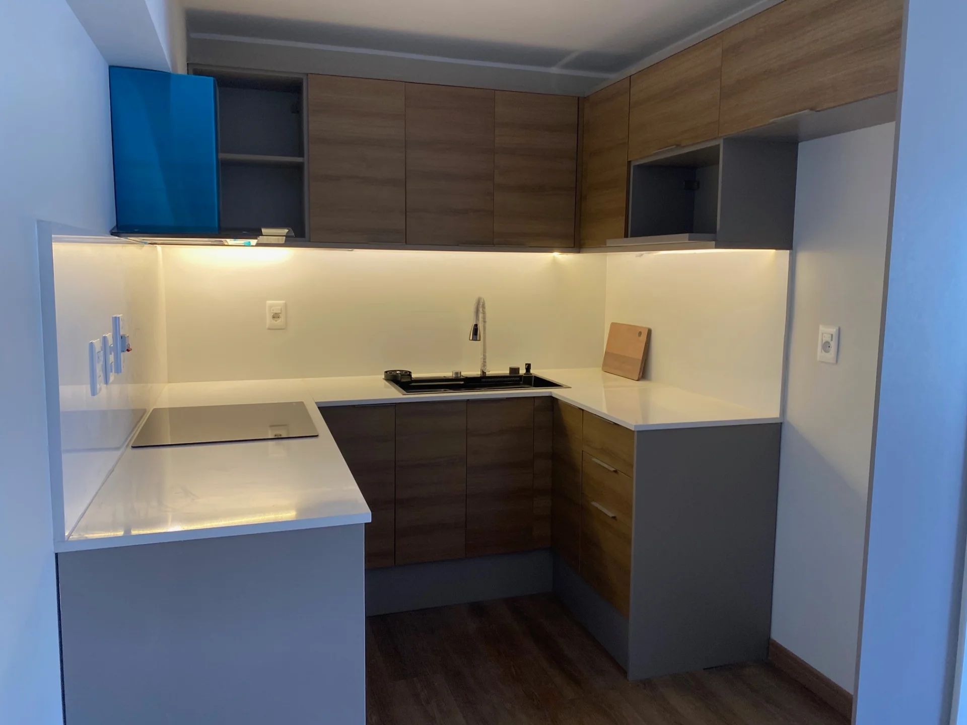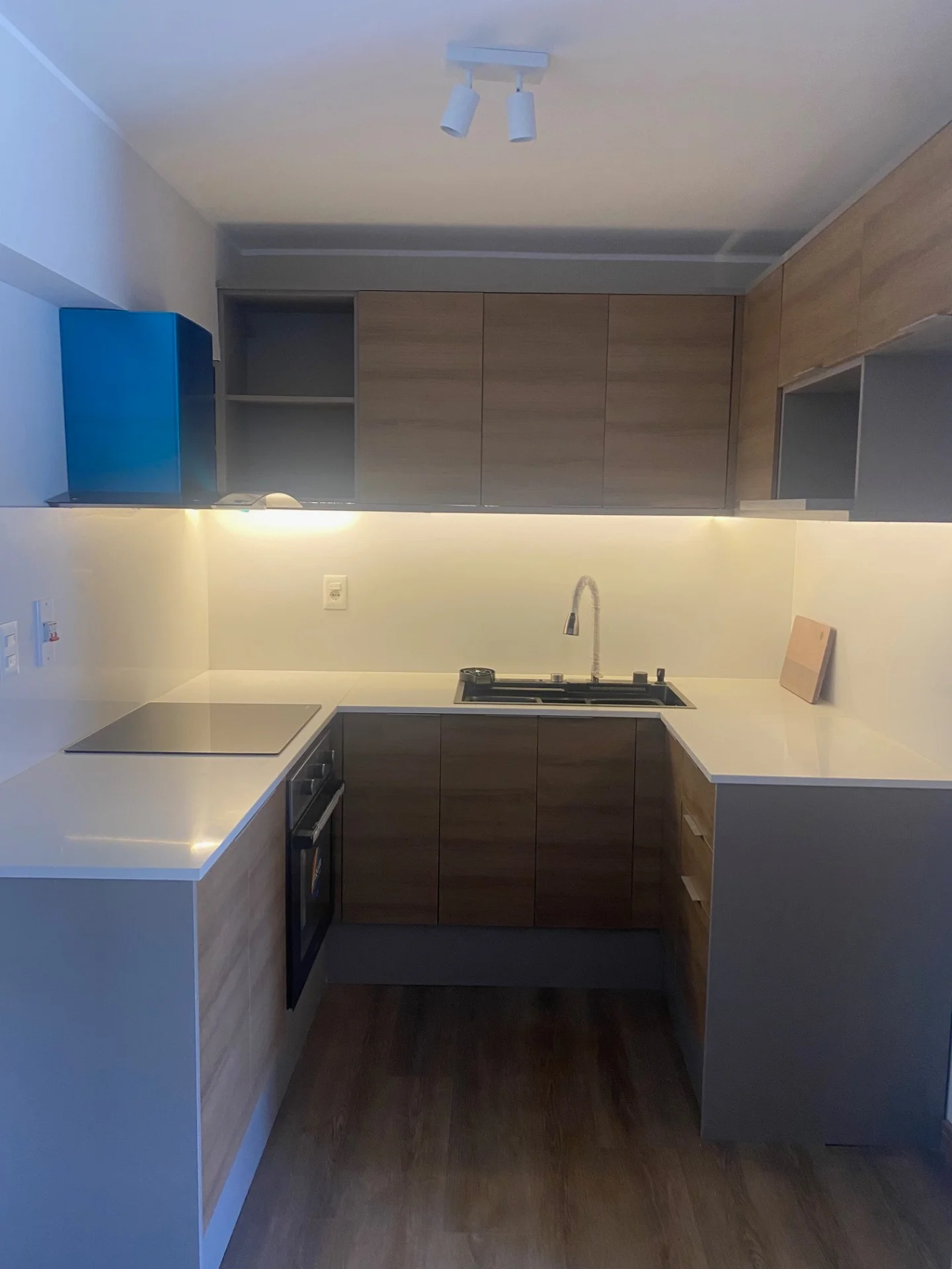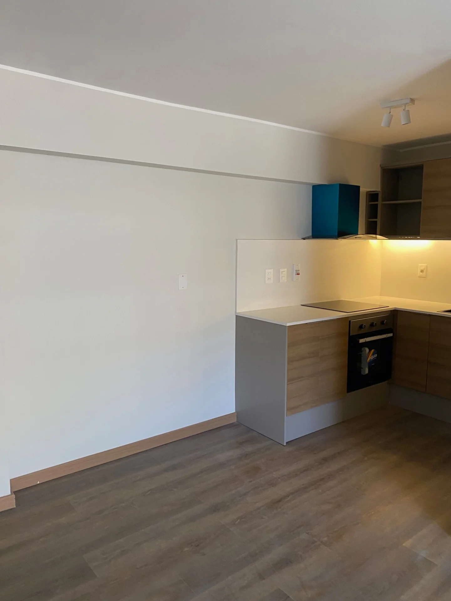 La cocina integrada está equipada con horno, campana y anafe, y cuenta con muebles aéreos y bajo mesada, ofreciendo un espacio moderno y funcional.
