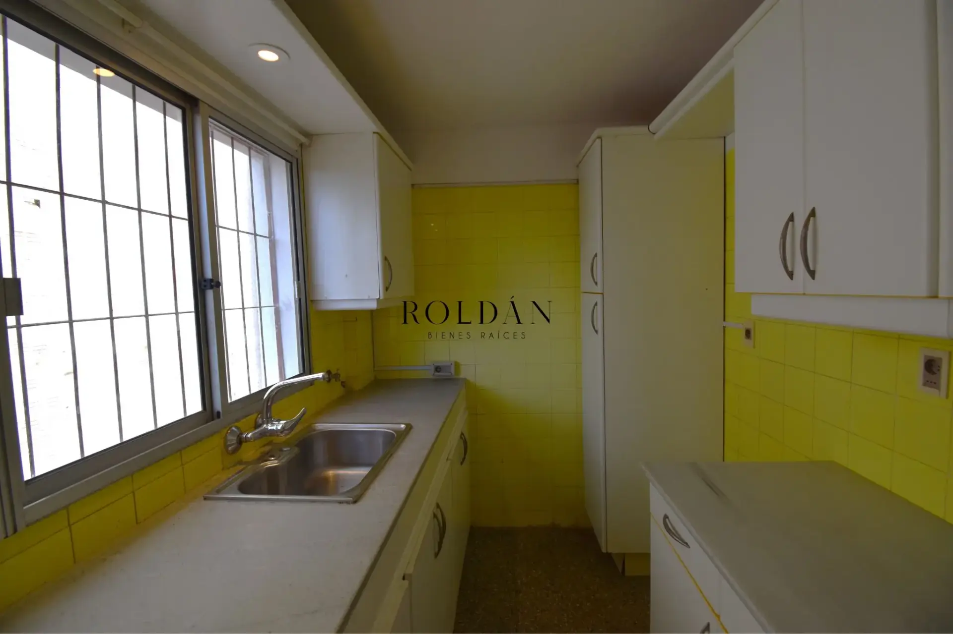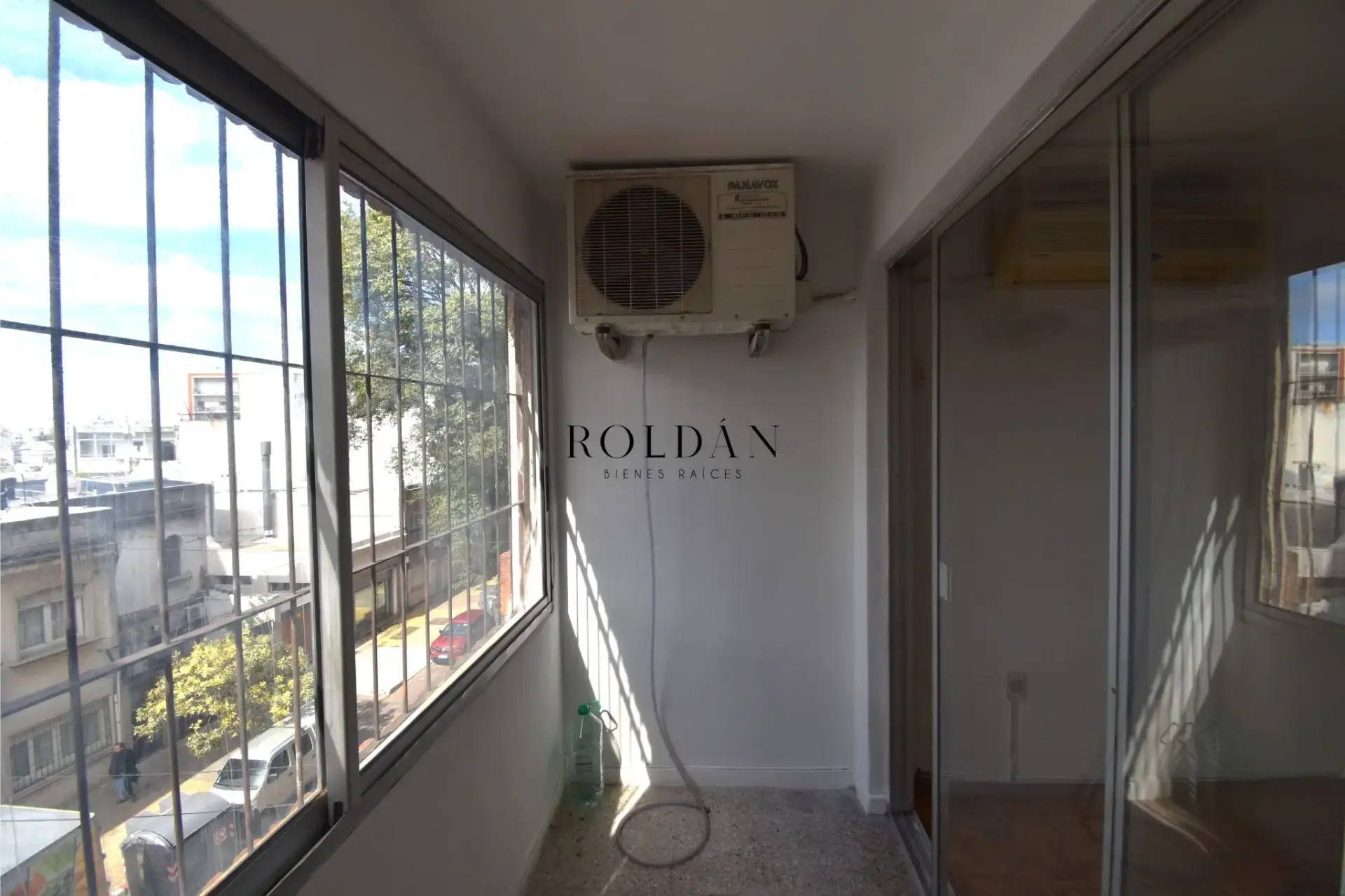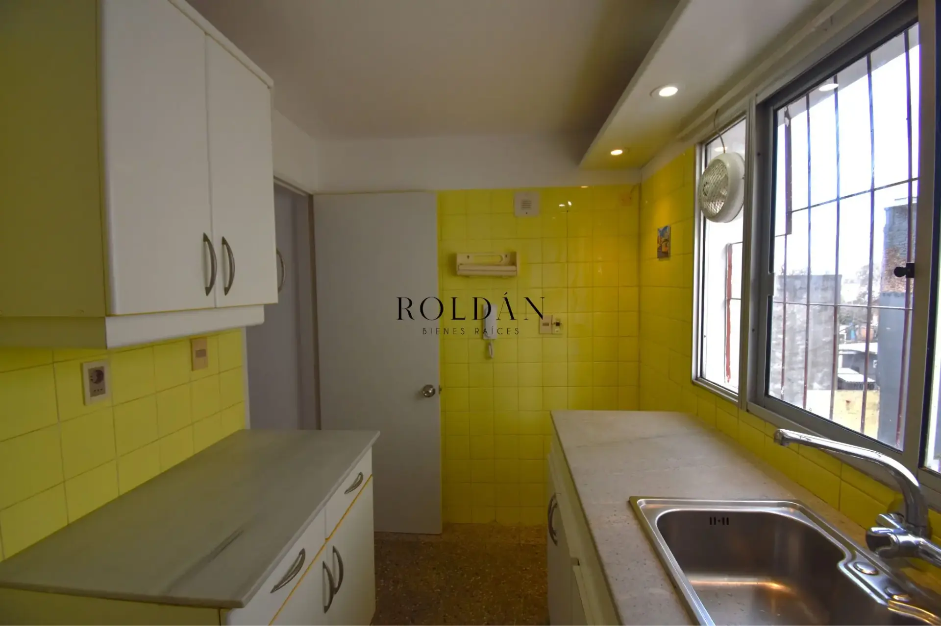 Amplio living comedor con piso de parquet plastificado, aire acondicionado y puerta ventana que permite acceso a cómoda terraza con rejas. Cocina definida al contrafrente con doble mesada, amplia ventana con rejas, extractor de aire, muebles aéreos y bajo mesada.