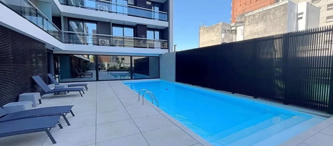 La cocina semi integrada incluye barra desayunadora, placares y electrodomésticos como heladera, microondas, tostadora, freidora de aire, horno, anafe, jarra eléctrica, cafetera y juguera. El living incluye aire acondicionado, rack para televisión, el dormitorio incorpora placard y aire acondicionado, y también accede al balcón. El baño es completo, con mampara, calefón y lavasecarropa. La terraza incluye set de mesa y sillas de terraza.