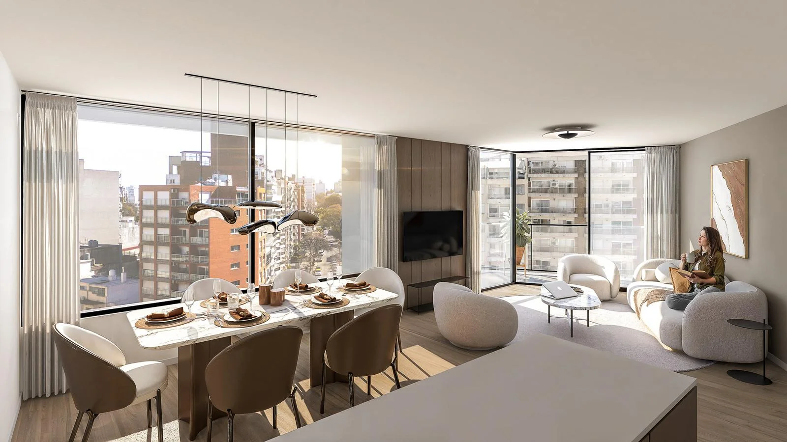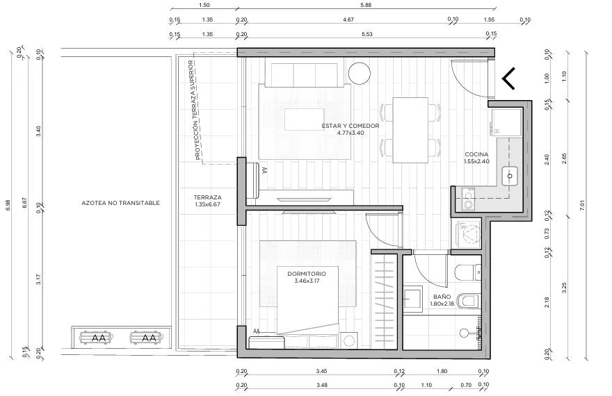 Este apartamento contará con un diseño contemporáneo y luminoso, con amplios ventanales que permitirán la entrada de luz natural durante todo el día. La distribución de los espacios está pensada para maximizar el confort y la funcionalidad. Dispone de un living-comedor con cocina integrada y salida directa a la terraza.