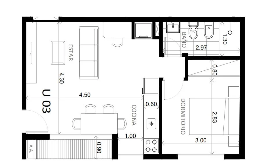 La unidad cuenta con cocina integrada, equipada con horno, anafe y campana, y se complementa con terminaciones de calidad como mesadas de cuarzo y revestimientos en porcelanato. El dormitorio dispone de placares empotrados, mientras que el sistema de automatización de persianas aporta practicidad y modernidad.