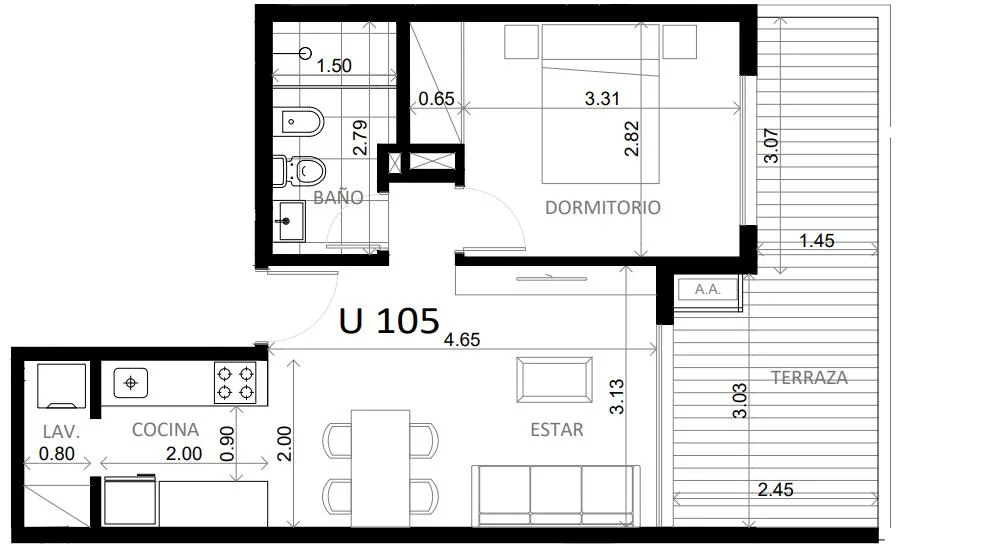 La unidad cuenta con cocina integrada, equipada con horno, anafe y campana, y se complementa con terminaciones de calidad como mesadas de cuarzo y revestimientos en porcelanato. El dormitorio dispone de placares empotrados, mientras que el sistema de automatización de persianas aporta practicidad y modernidad.