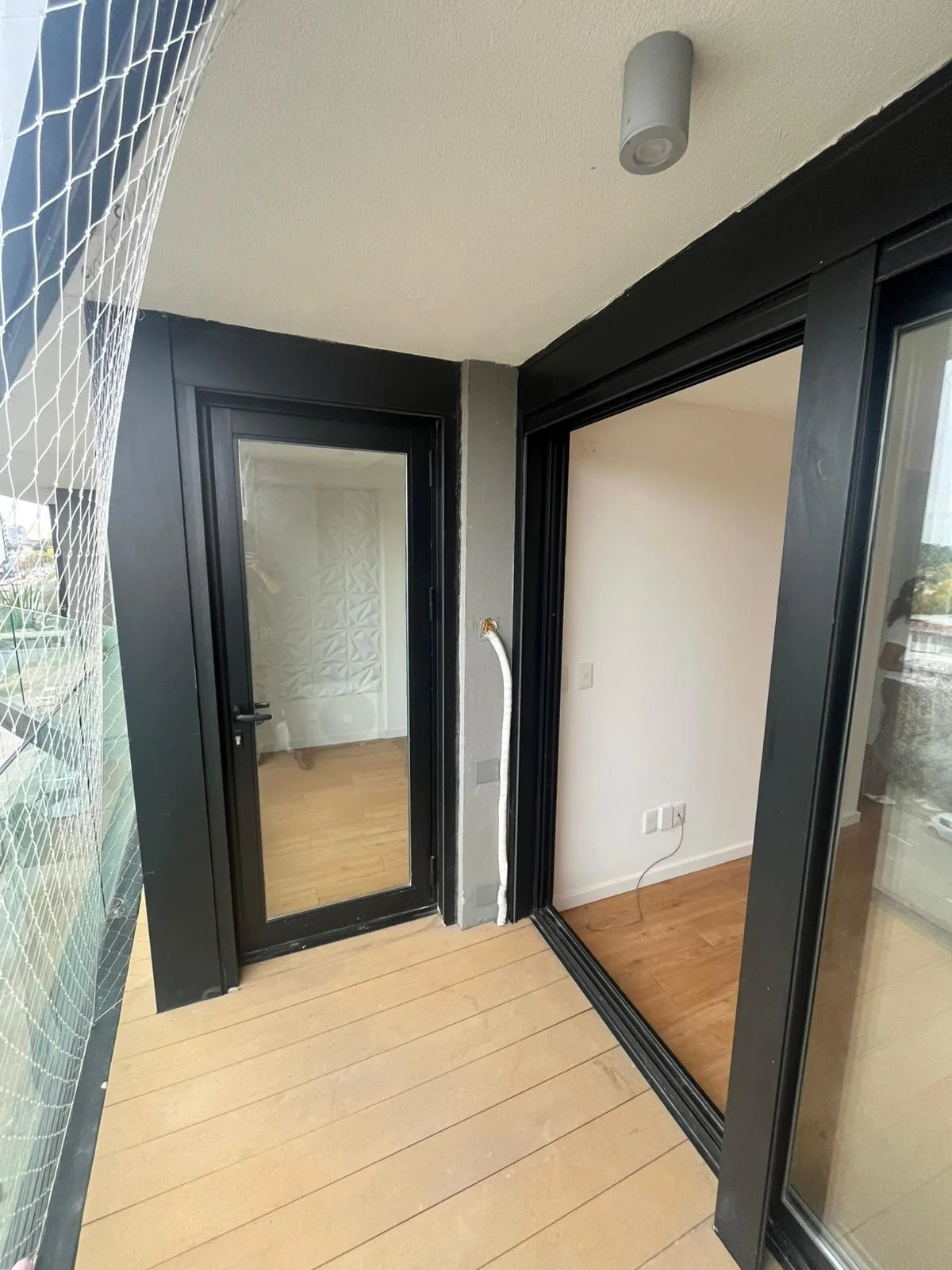 Tiene 2 dormitorios bien distribuidos, ambos con placard, y un baño completo de diseño moderno. Los pisos en tono madera, las aberturas de líneas oscuras y los acabados contemporáneos le dan una estética cálida y actual.