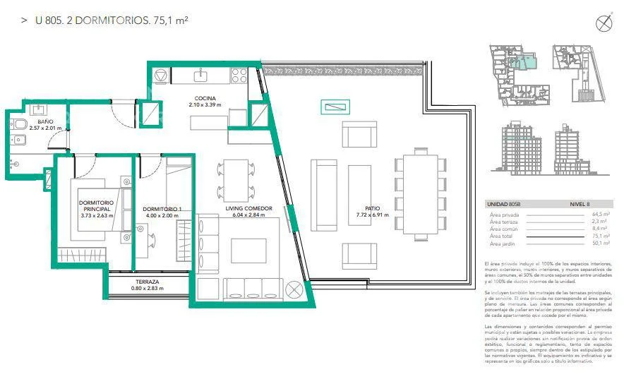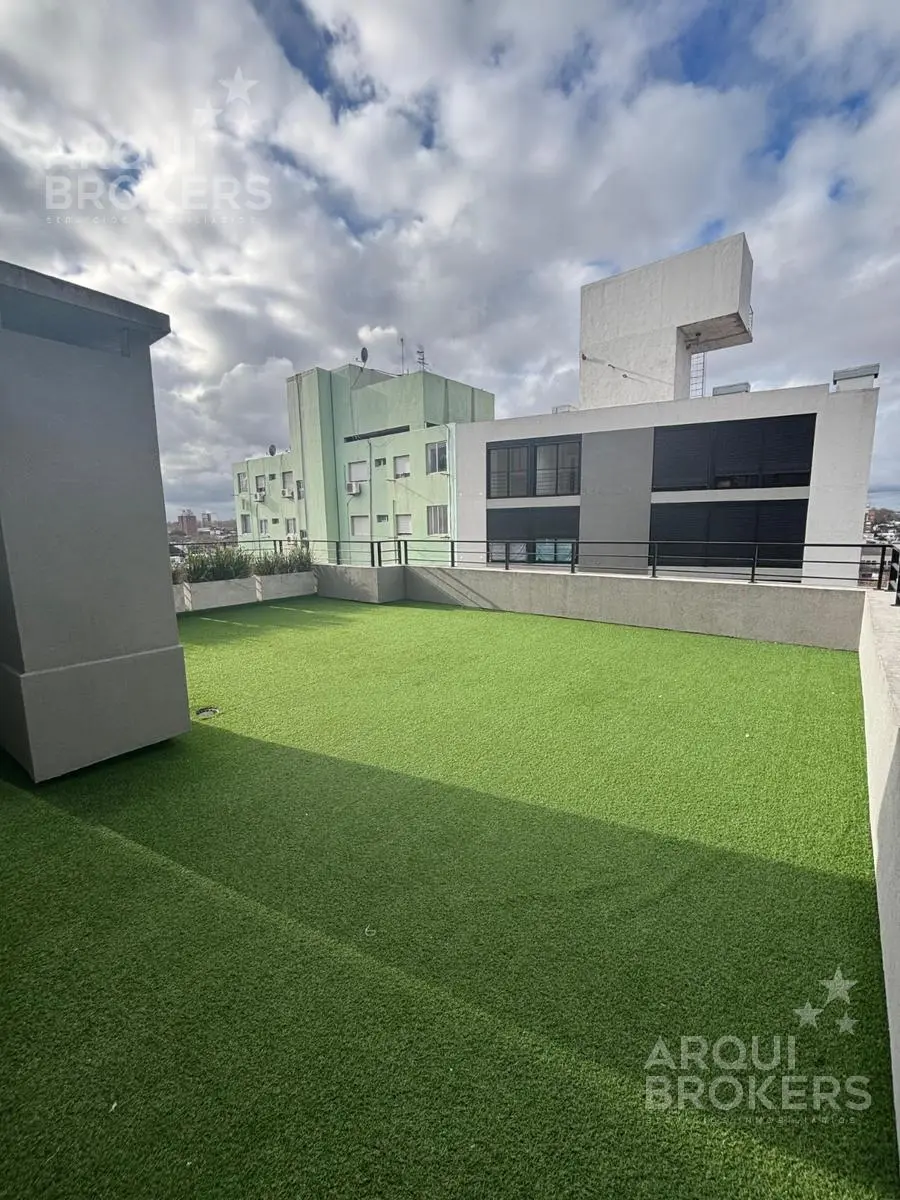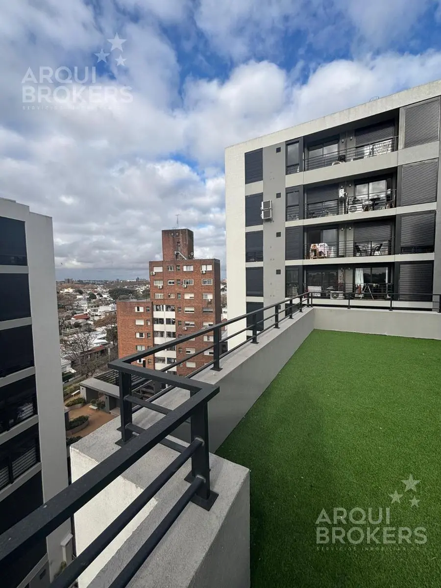 Piso 8 contrafrente. Living comedor con salida a terraza y cocina definida, 2 dormitorios y 1 baño, patio de 47 m2.
