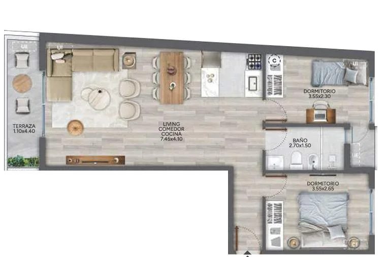 Este apartamento ofrece un diseño moderno y funcional, ideal para quienes buscan comodidad y buena iluminación. Cuenta con un amplio ventanal con salida a una terraza que aporta luz natural durante todo el día, creando un ambiente cálido y agradable.