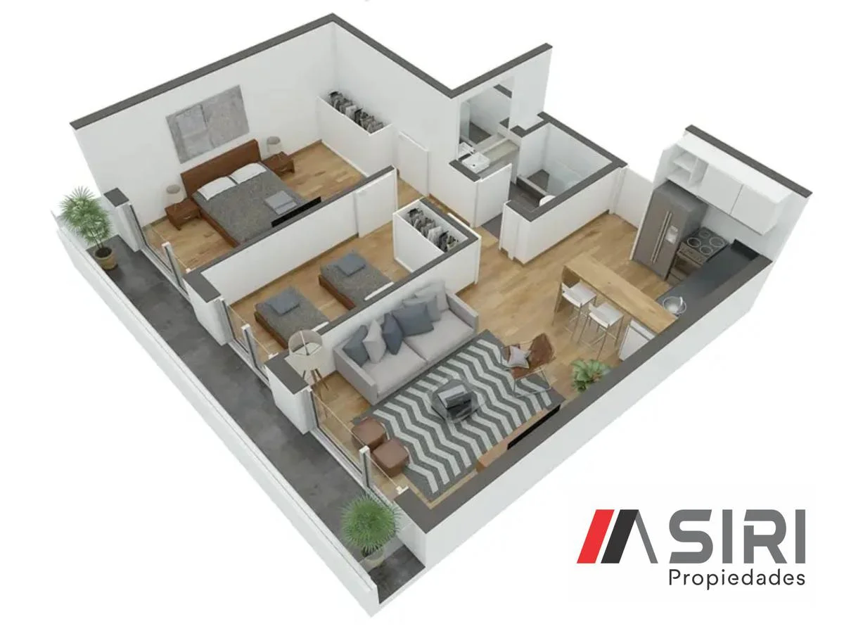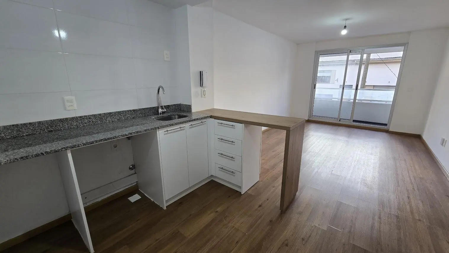 El apartamento cuenta con living comedor con acceso a terraza. La cocina es integrada y tiene muebles bajo mesada y barra.