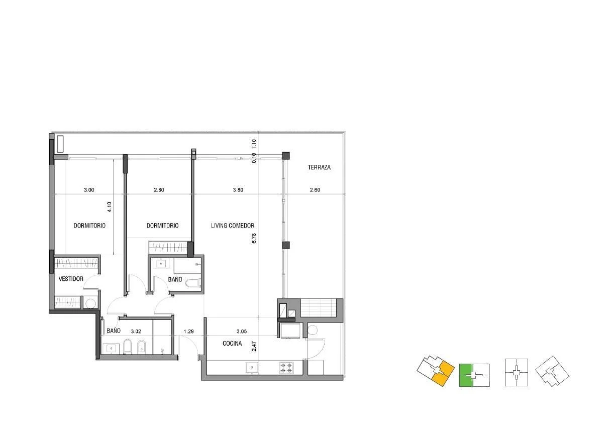 Living comedor con salida a terraza con parrillero, cocina integrada con placares, terraza lavadero, 2 dormitorios, el principal en suite con vestidor, ambos con salida a terraza, 2 baños completo.
