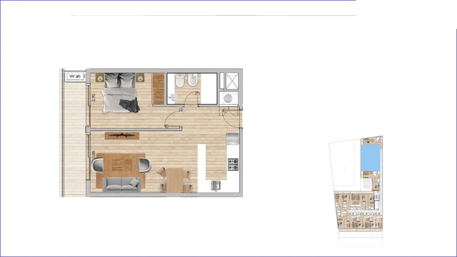 Living comedor con terraza, cocina integrada con placares, campana, anafe y termotanque, 1 dormitorio con placard y cortina de enrollar, 1 baño completo con placard.