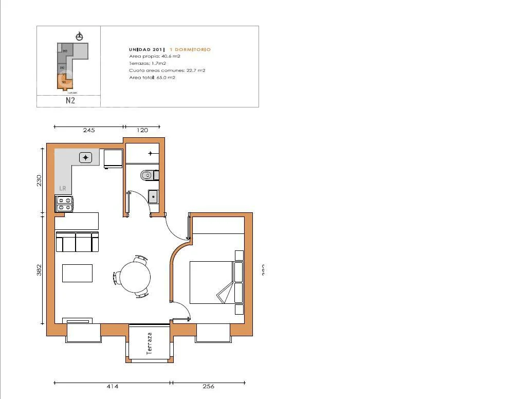 Living comedor con terraza, con cocina integrada con placares sobre y bajo mesada, anafe y campana, termotanque eléctrico, conexión para lavarropas. 1 dormitorio, 1 baño completo. Pisos de porcelanato. Preinstalación para aire acondicionado.