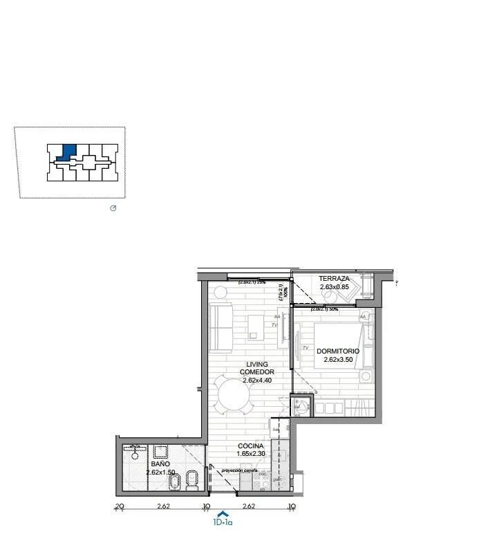 Living comedor con terraza, cocina integrada con placares, 1 dormitorio y 1 baño.