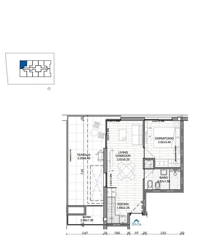 Living comedor con amplia terraza de 21 m2, cocina integrada con placares, 1 dormitorio y 1 baño.