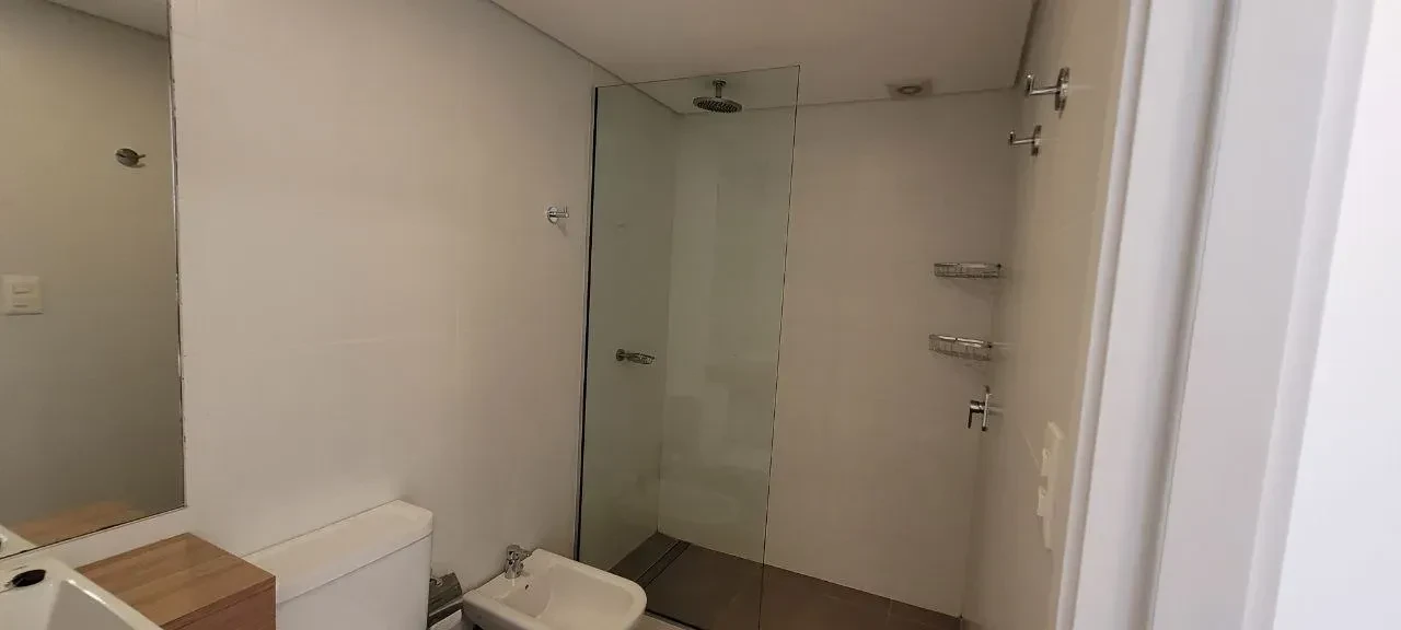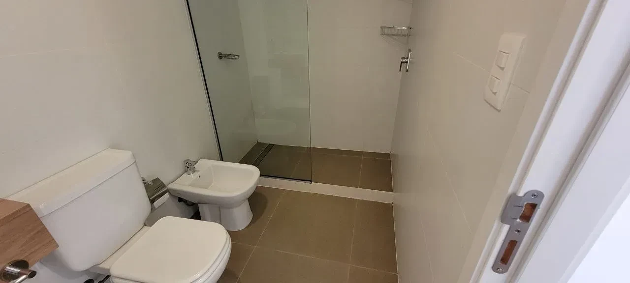 1 baño completo con duchero, mampara de vidrio, lavatorio y bidet.