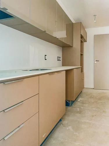 - Placares sobre y bajo mesada en melaminico 18mm hechos a medida, con estilo rústico y modernos herrajes, en cocina.