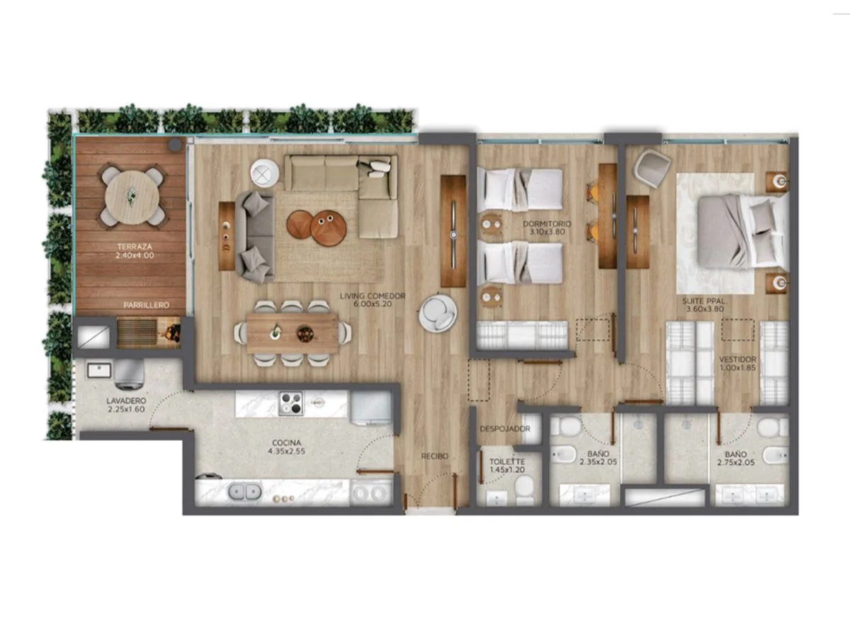 Living comedor con acceso a terraza con parrillero, despojador, toilette y cocina definida con lavadero. 2 dormitorios en suite, principal con vestidor. Incluye 1 garaje grande y baulera.