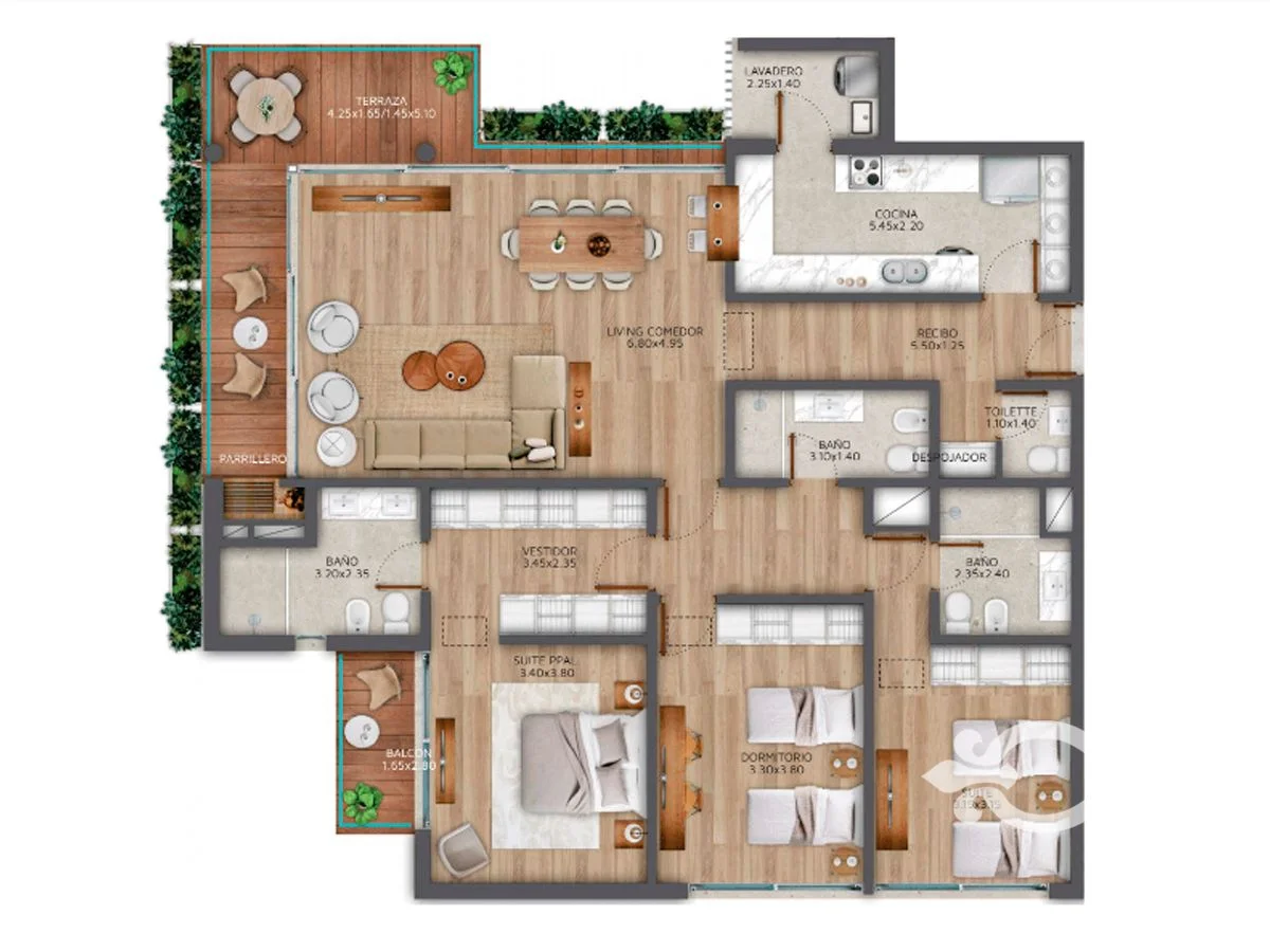 Living comedor con acceso a terraza con parrillero, toilette, cocina definida con pasaplatos y sala lavadero. 3 dormitorios, principal en suite con vestidor y salida al balcón, 2do dormitorio en suite y 3ro en semi suite. Incluye 1 garaje grande y baulera.