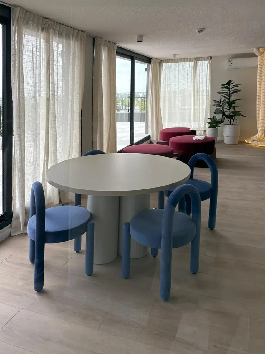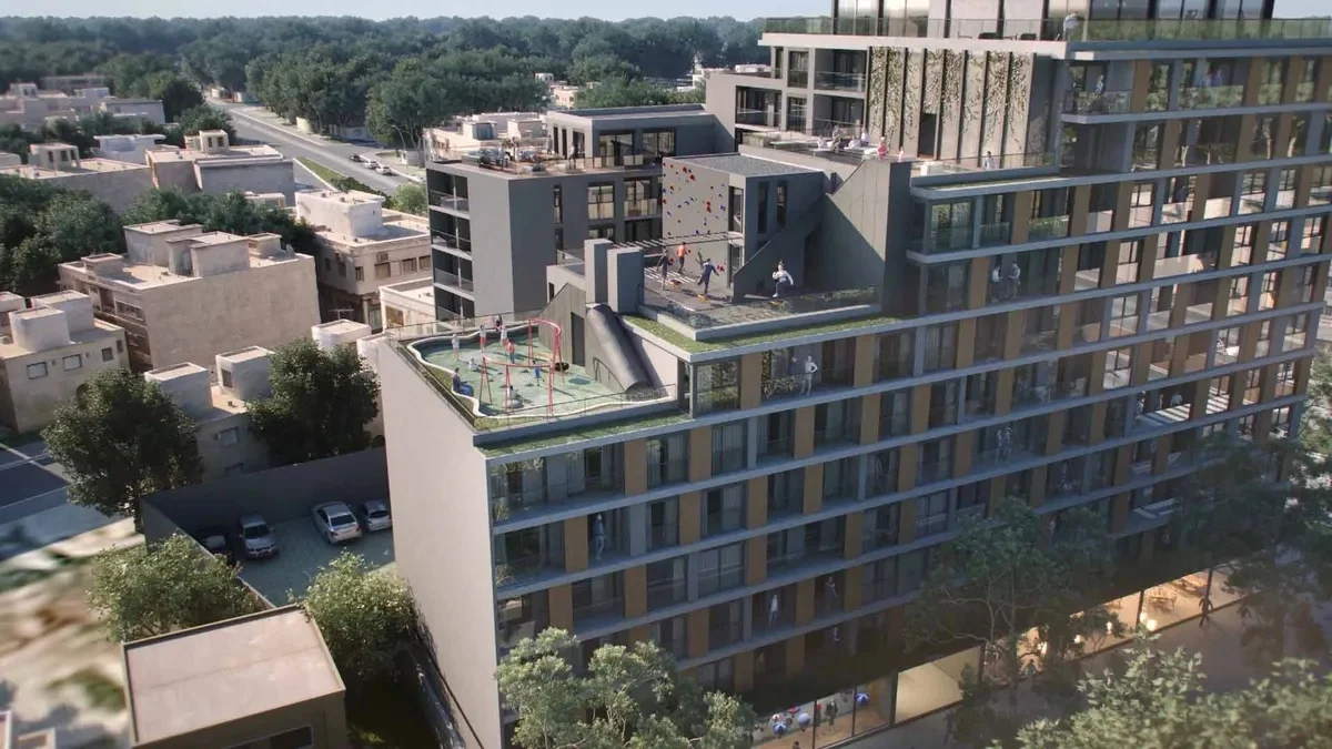 El complejo residencial Nórdico/Ventura, situado en una de las esquinas más destacadas de La Blanqueada. Se han diseñado áreas comunes que fomentan el esparcimiento y la actividad al aire libre.