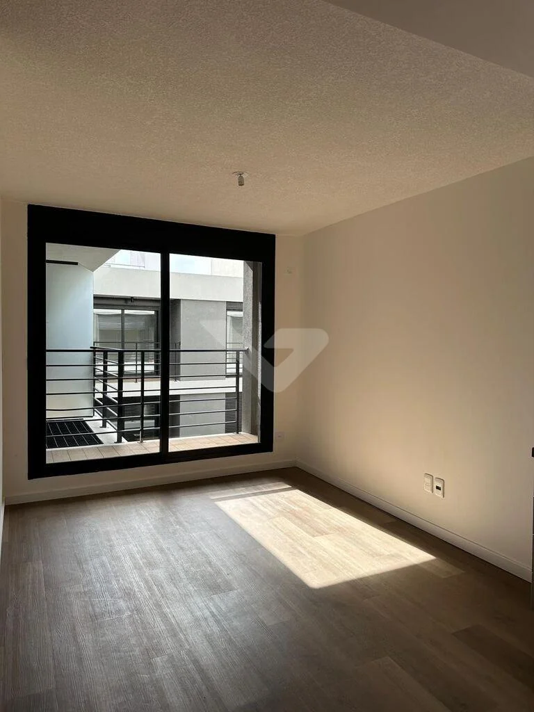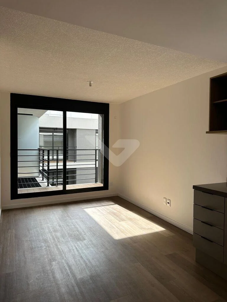 Living comedor con cocina integrada con ventanal hacia el balcón.