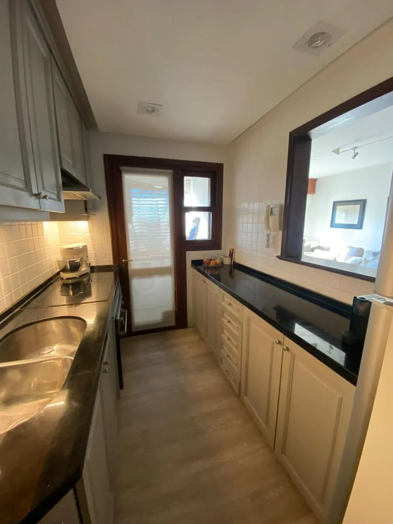 La cocina definida estilo americano se presenta con una mesada de mármol negro, pileta amplia, extractor, muebles aéreos y bajo mesada con capacidad real de guardado. El pasa-platos hacia el living permite integrar reunión familiar, trabajo o cenas sociales manteniendo la independencia del área de cocción. Además, incorpora terraza de servicio, una ventaja poco habitual en unidades contemporáneas.