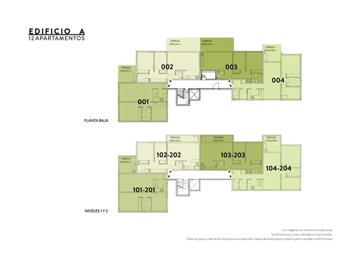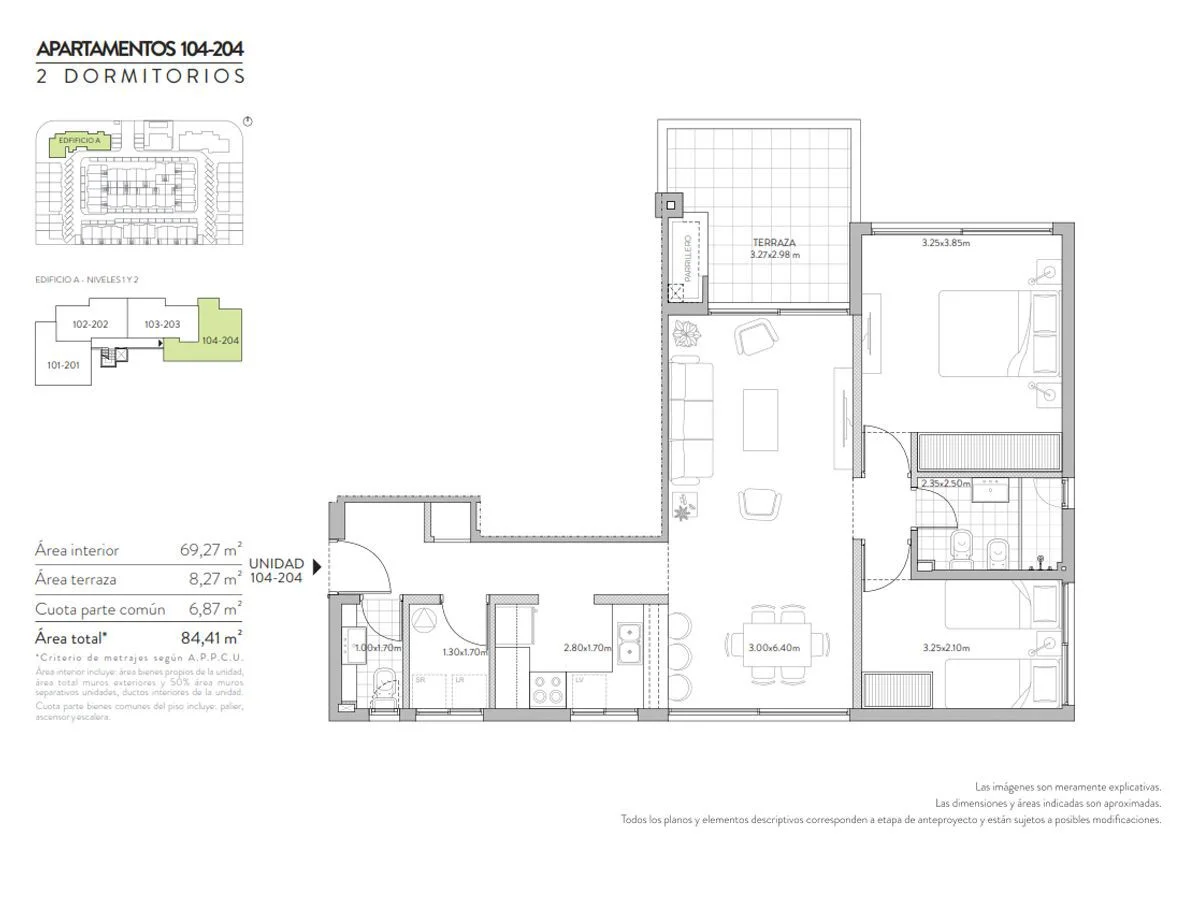 69,27m² interiores + 8,26m² de terraza + 6,87m² de área común = totales 84,40m²