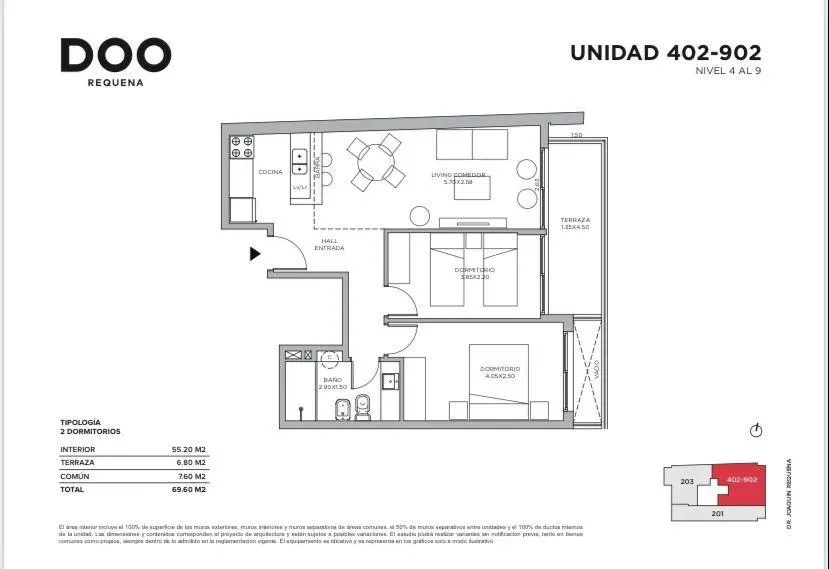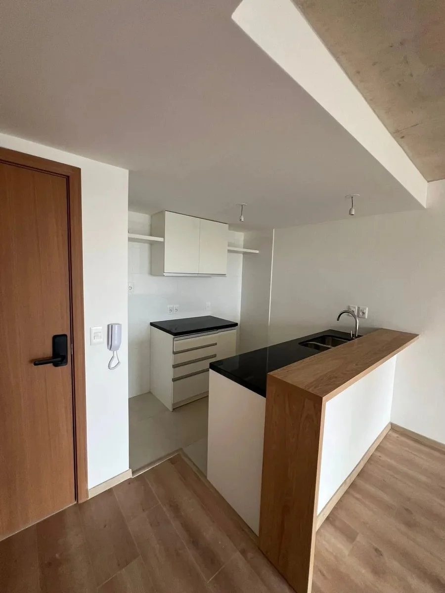 La unidad cuenta con un luminoso living-comedor de generosas dimensiones, con salida directa a la terraza, perfecta para disfrutar del aire libre y sumar amplitud al espacio social. La cocina integrada, con barra y diseño contemporáneo, aporta practicidad y un estilo actual que se integra muy bien al ambiente principal.