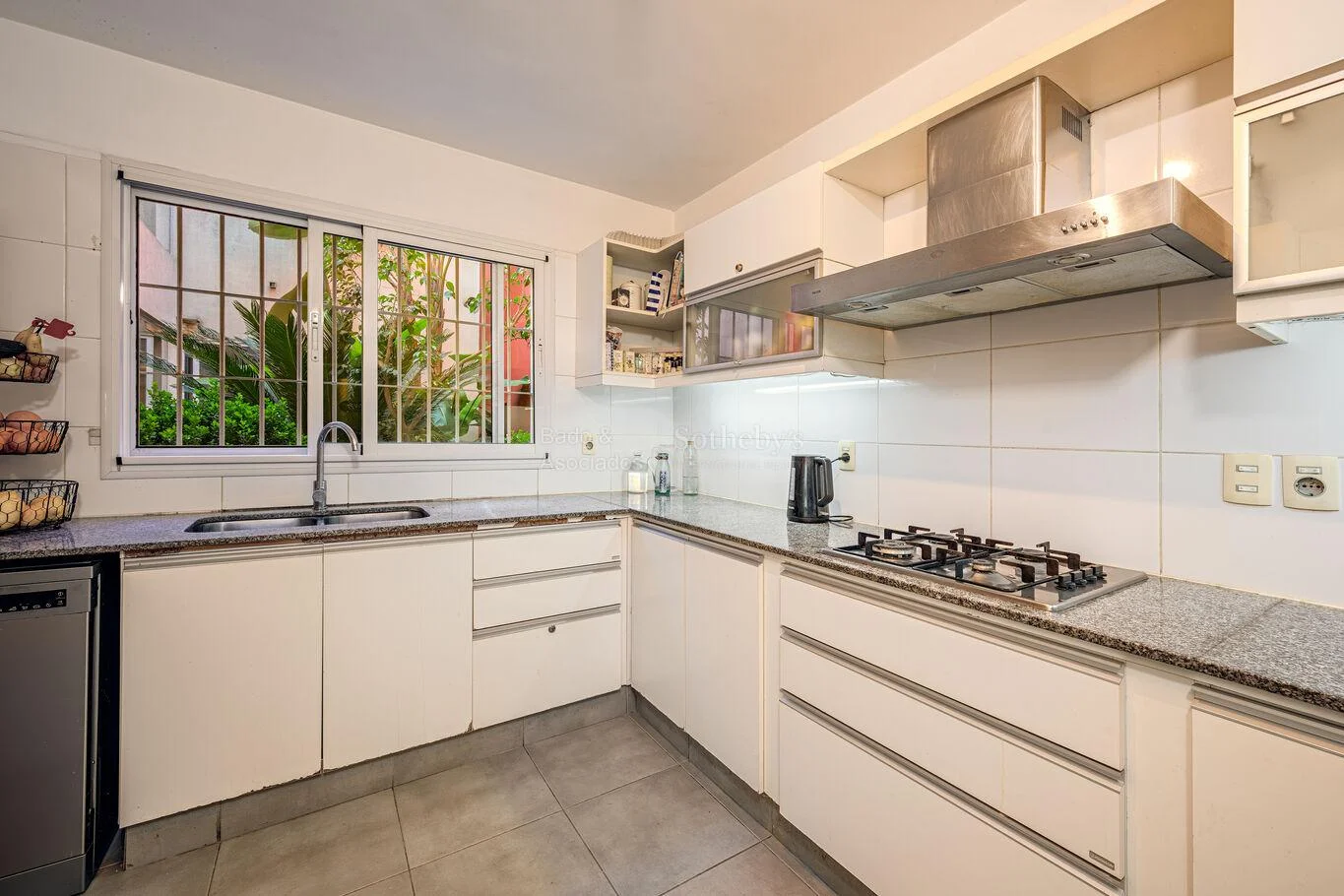 La cocina definida, con acceso independiente por puerta de servicio, se complementa con lavadero y patio con palmeras, creando un ambiente verde y sereno dentro del hogar.