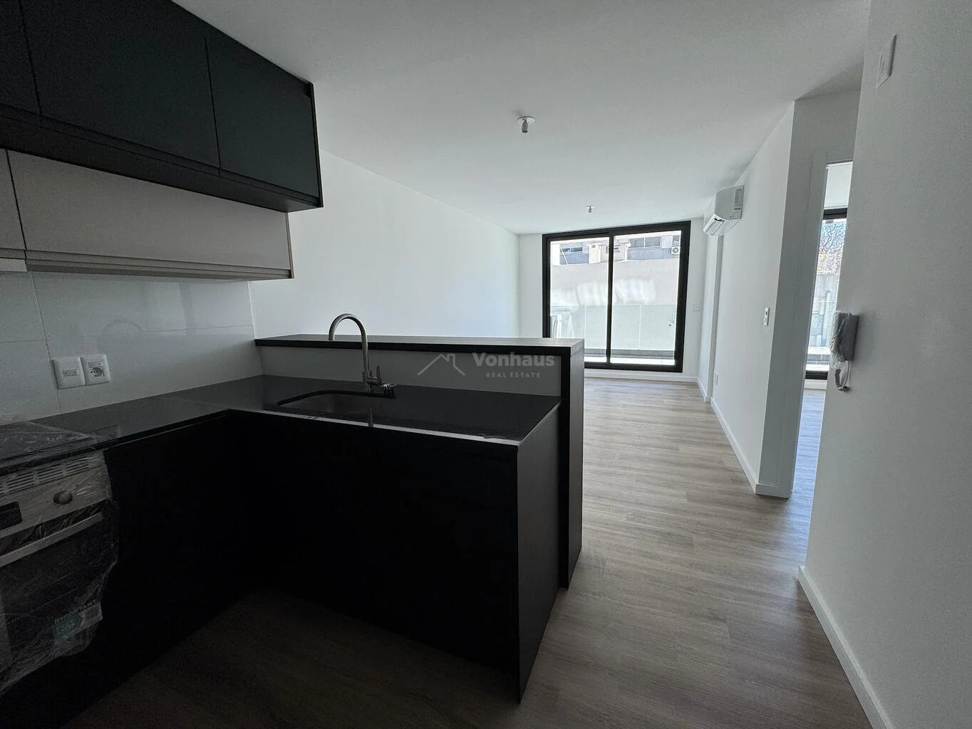 Living comedor con cómoda cocina integrada delimitada por barra. Incluye, campana extractora, anafe vitrocerámico, horno, calefón y aire acondicionado.