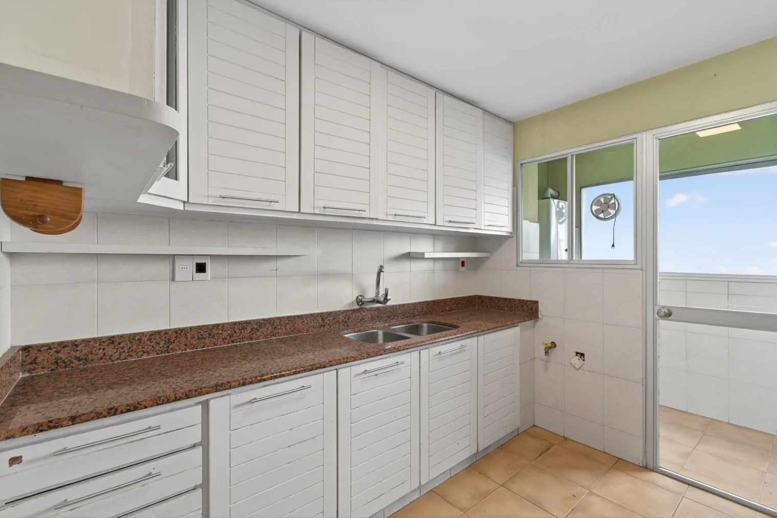 Cocina definida de buen tamaño, con gran capacidad de almacenamiento. Cuenta con mesadas de granito, lavabo con grifería monocomando y doble bacha de acero inoxidable. Dispone de gas por cañería y grasera colectiva.