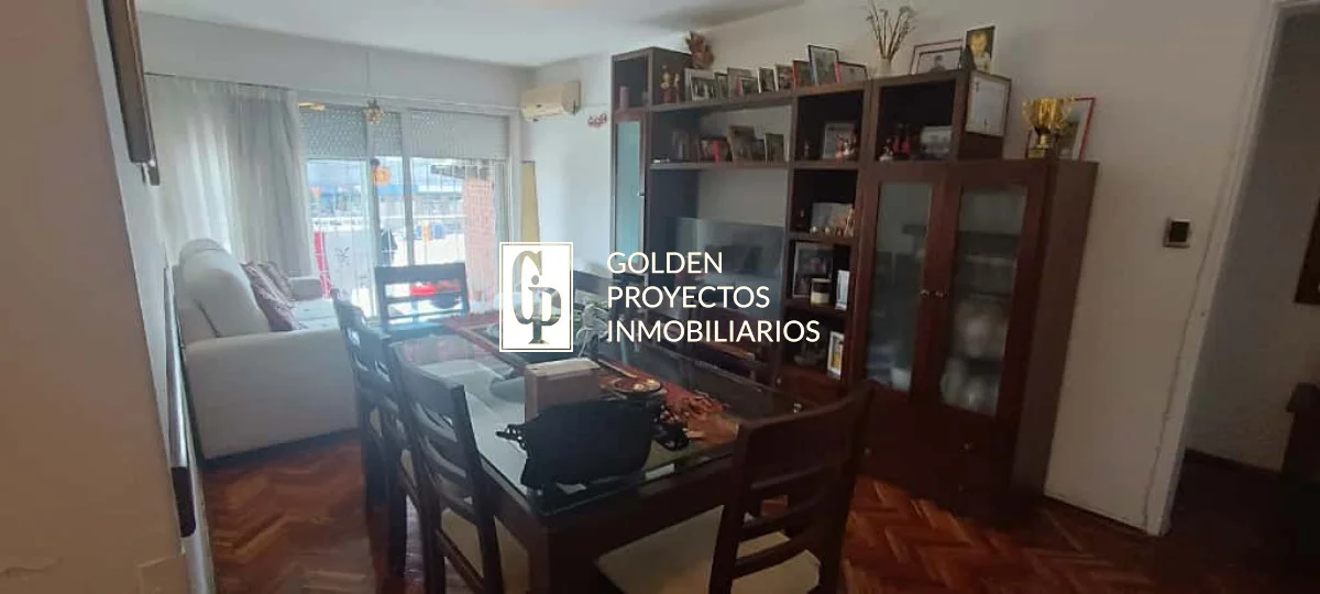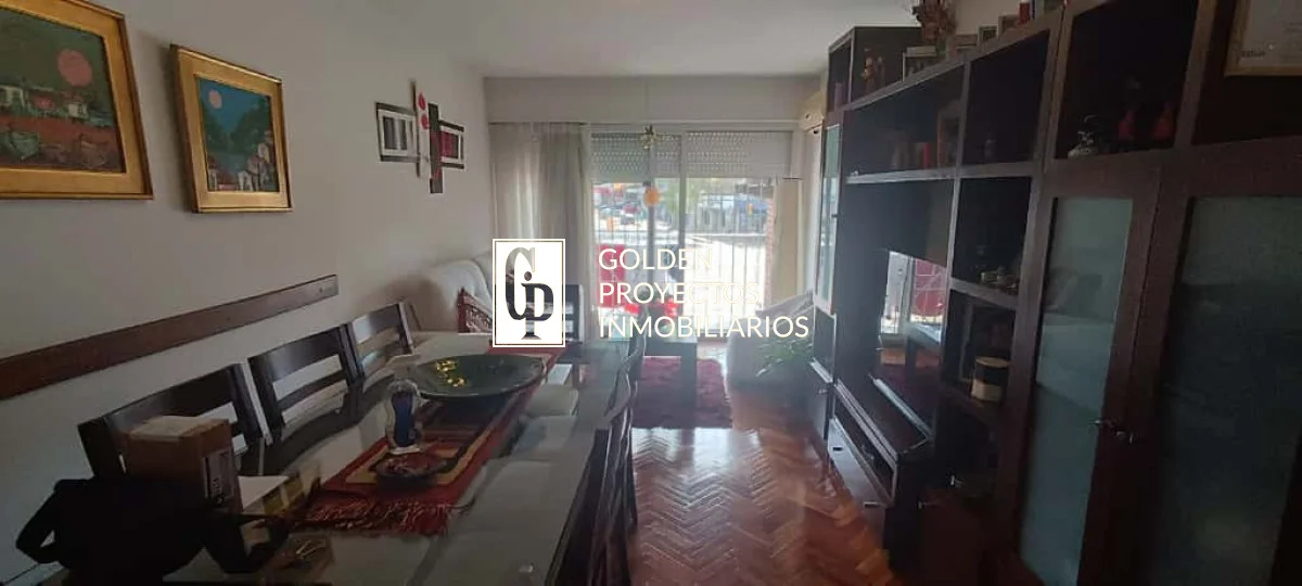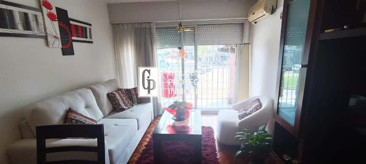 Amplio living comedor con aire acondicionado y balcón al frente.