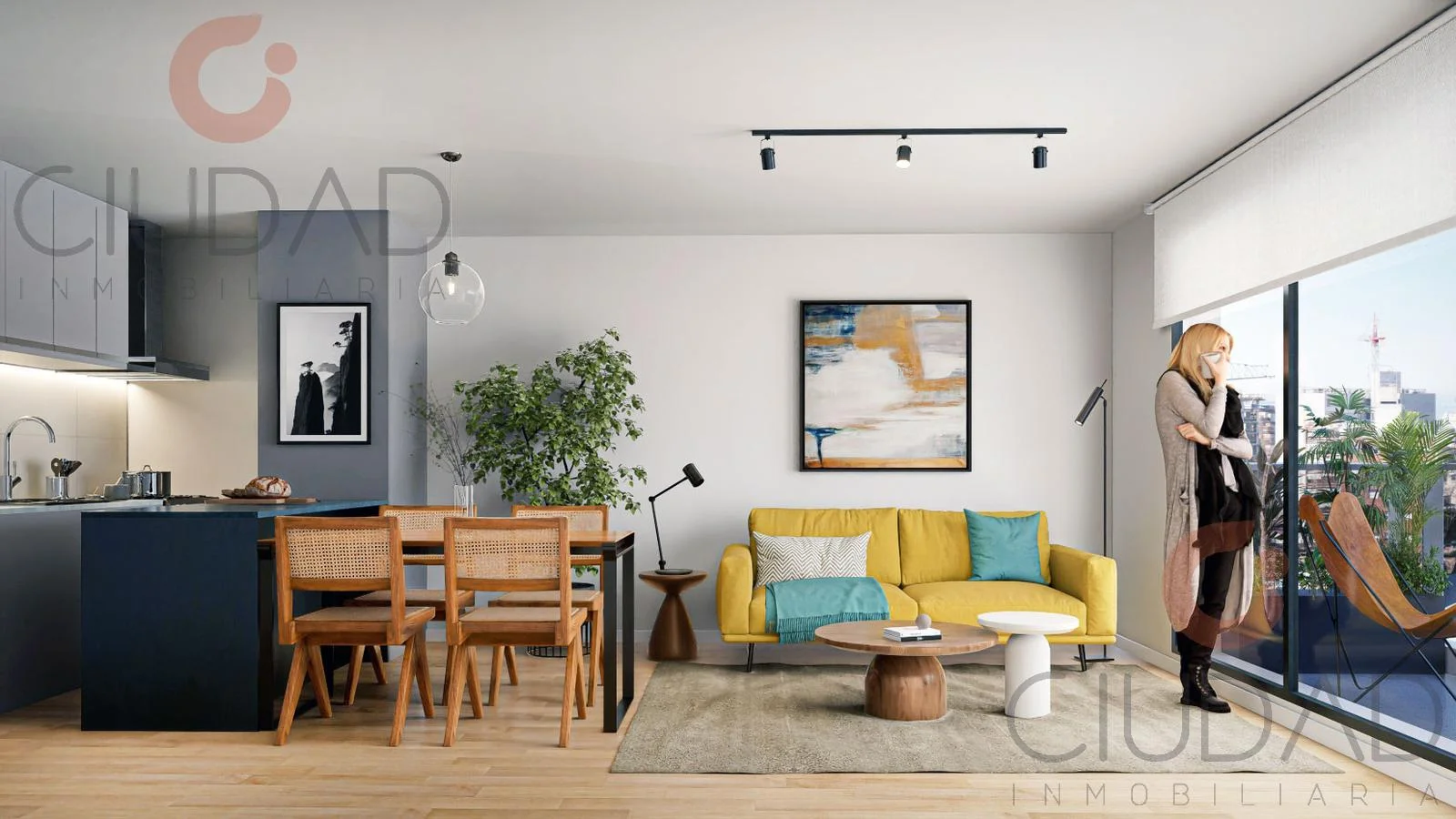 - Living comedor con cocina semi integrada con barra.