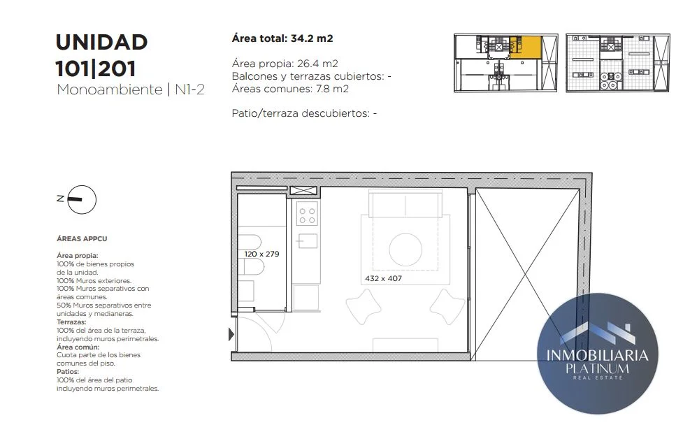 - Unidades Monoambientes con grandes ventanales de riel triple y acceso a tender común en azotea