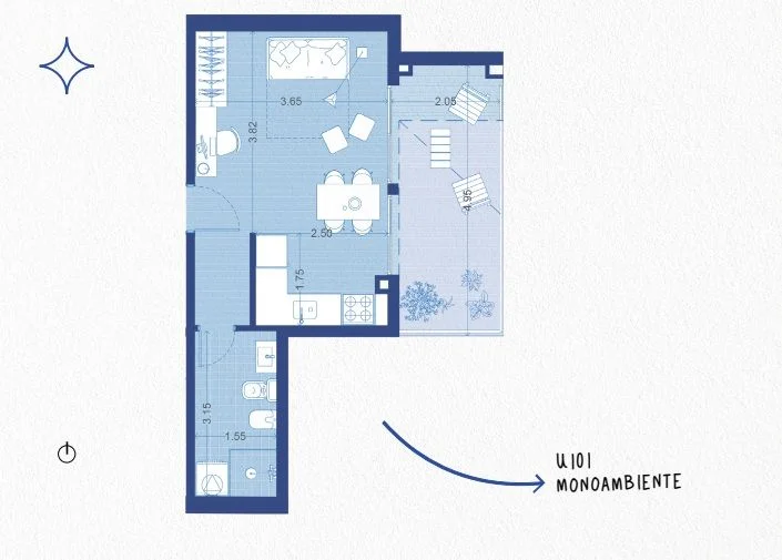 Unidad 101 - Se trata de un 1 ambiente en primer piso con 37 m2 de superficie total, 26,5 m2 cubiertos, y 10 m2 de terraza. Compuesto por 1 ambiente con cocina integrada, salida a patio de uso exclusivo y baño completo.