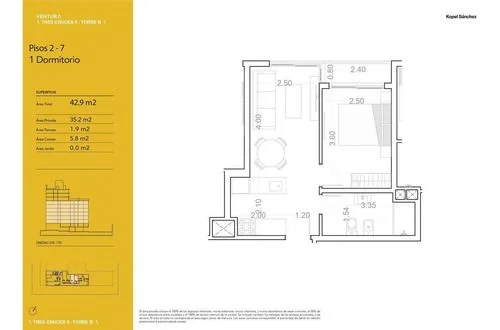 Unidad 510: Se trata de un apartamento de 37.1 m² compuesto por: Living-comedor con salida a terraza, 1 dormitorio, cocina integrada y baño.