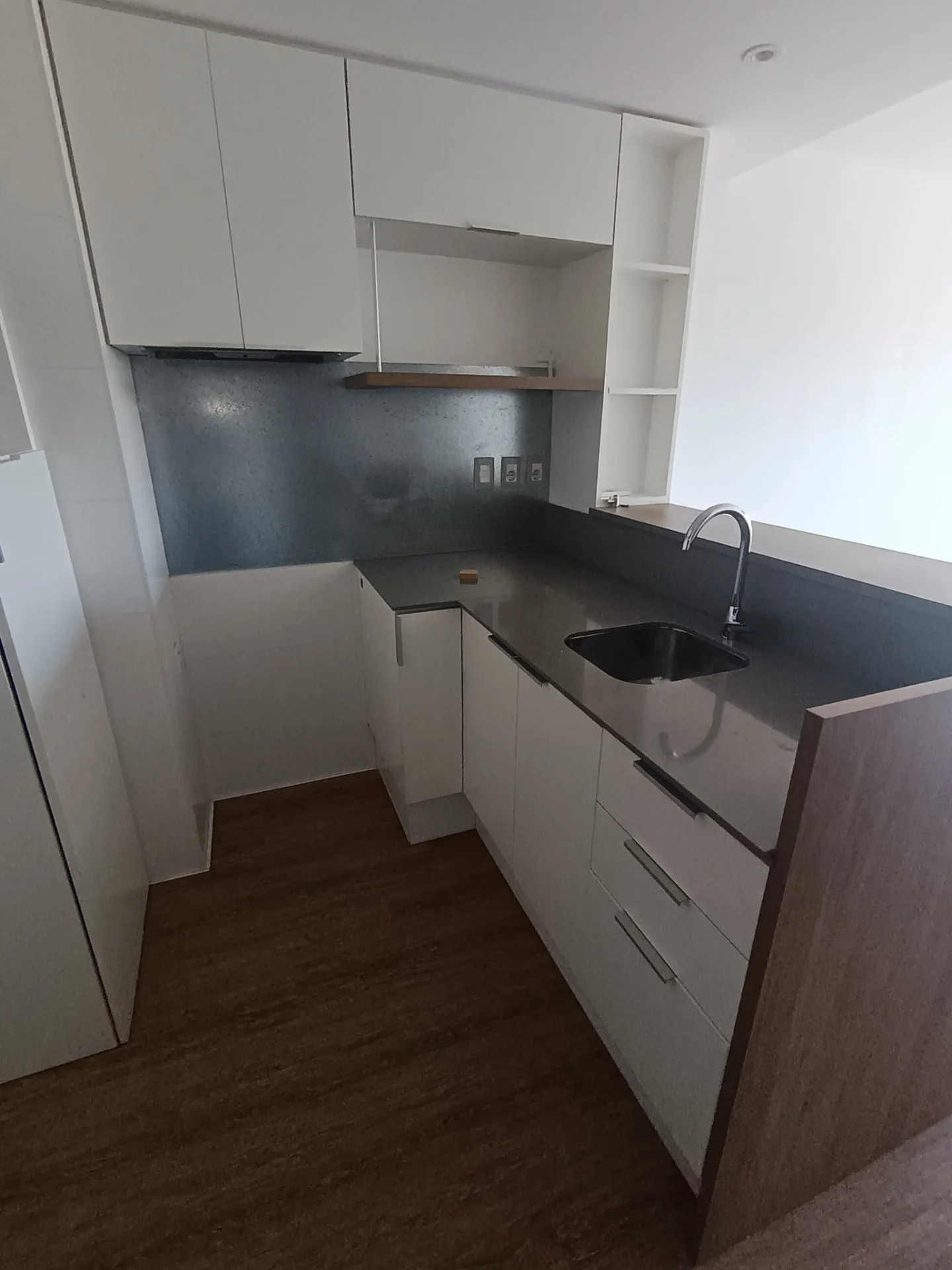 Cocina estilo americana con placares aéreos y de bajo mesada, purificador de aire instalado.