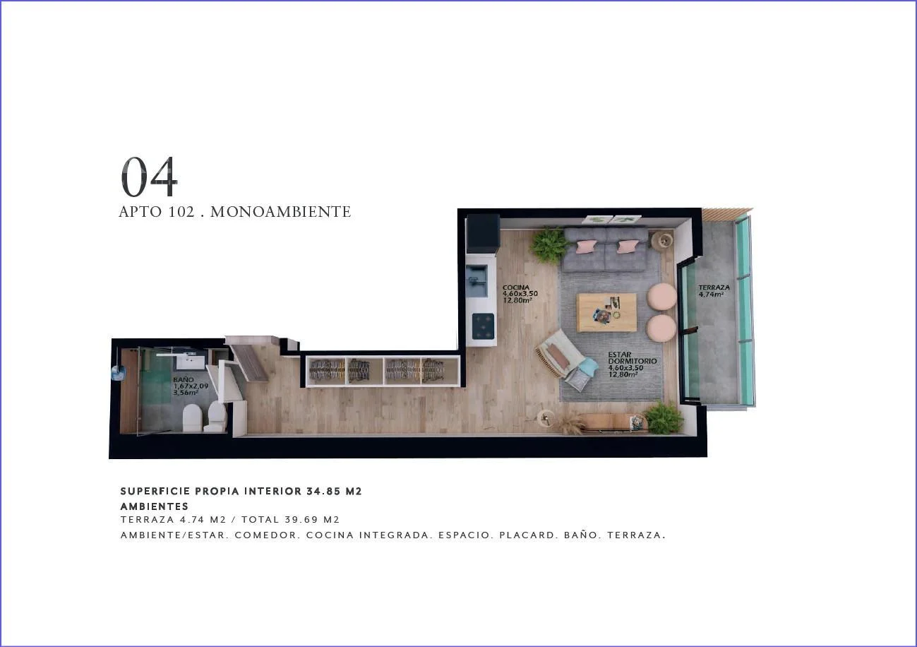 Monoambiente con terraza al frente, cocina integrada con placares, 1 baño.