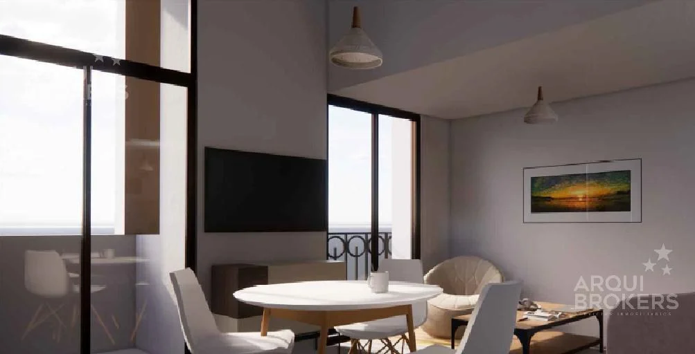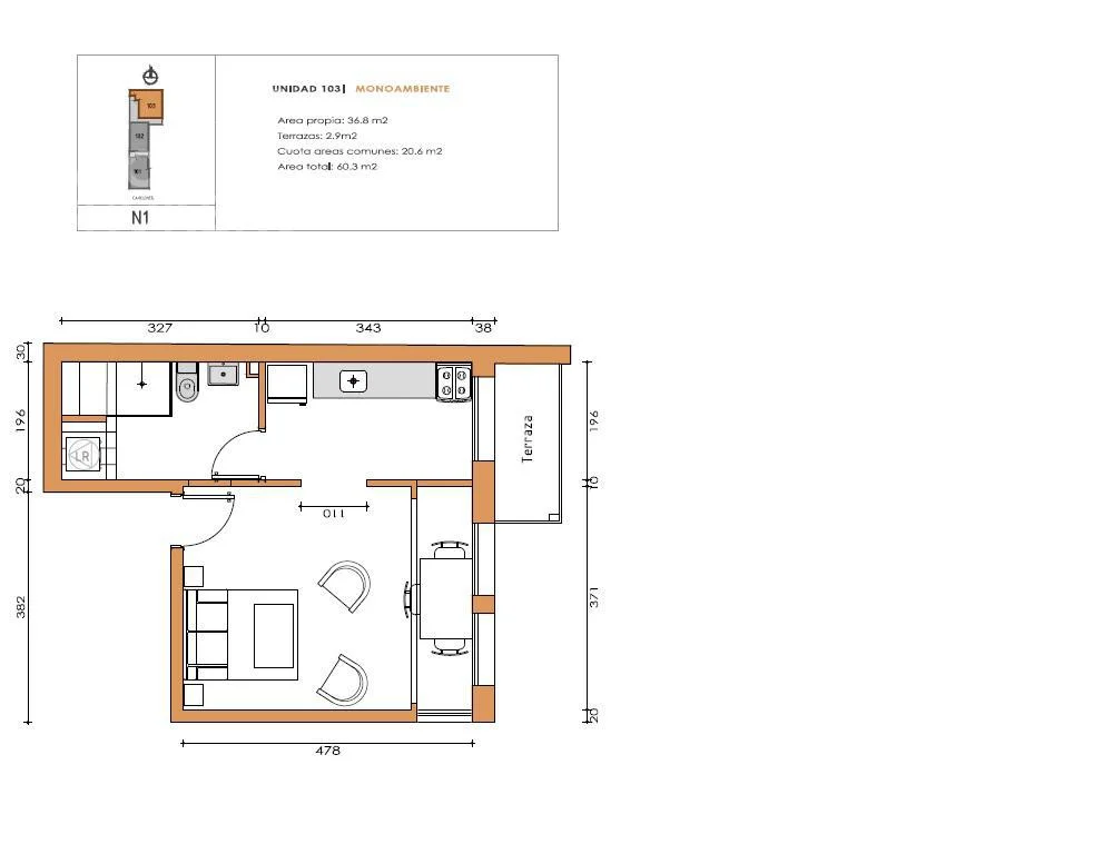Monoambiente con terraza, cocina integrada con placares sobre y bajo mesada, anafe y campana, termotanque eléctrico, conexión para lavarropas. 1 baño completo. Pisos de porcelanato. Preinstalación para aire acondicionado.