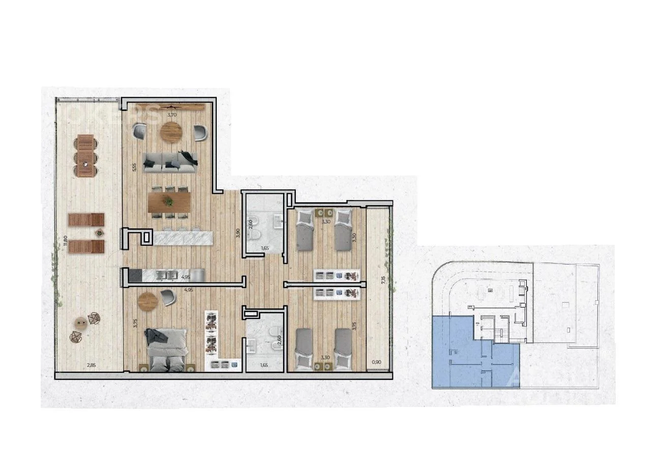 Living comedor con terraza al frente de 44 m2, cocina integrada con placares bajo y sobremesada, campanas extractoras de acero inoxidable, horno eléctrico de empotrar y anafe vitrocerámico sobre mesada. 3 dormitorios con placares, 1 en suite con vestidor, 2 baños completos.
